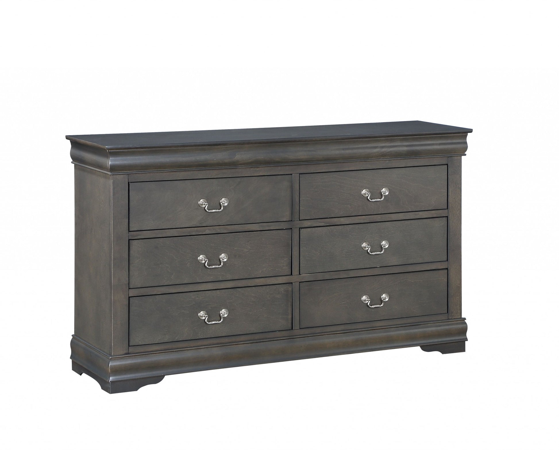 Make your room functional and visually enticing with this masterful 15-inch gray solid wood double dresser. This horizontal double dresser has column style drawers and a wide top surface area to help you with your daily dressing essentials. This dresser is built to last from high quality solid wood, the gray coloration of this piece is neutral and will blend easily with most any decor. 33-inch H x 15-inch W x 57-inch D