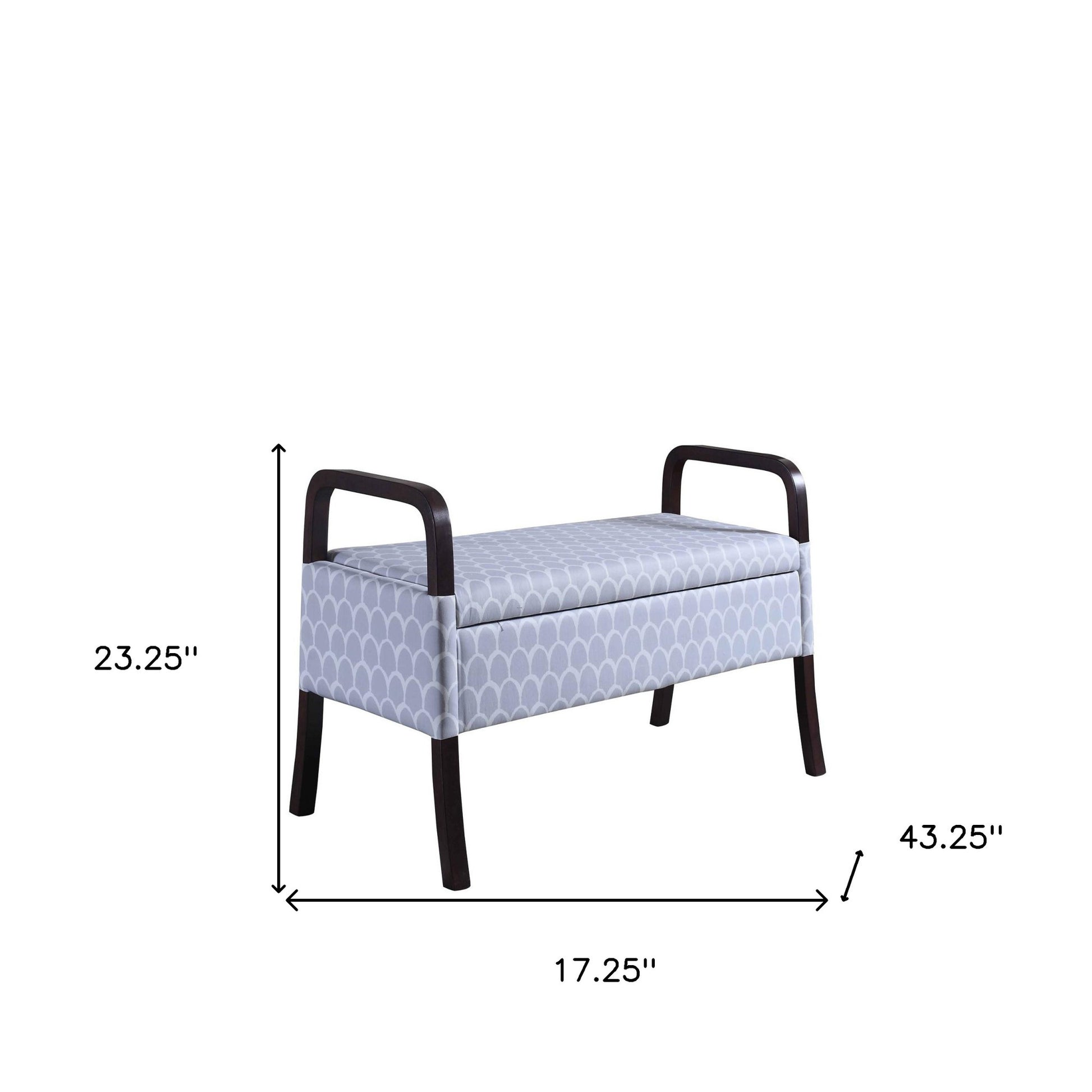 Distinctive in style the 17" black and gray upholstered 100% polyester trellis entryway bench with flip top radiates a versatile charm. A black solid wood frame is finished off with a gray upholstery seat that is the epitomy of quality construction and design. Expertly upholstered with padding and soft 100% polyester in a trellis pattern, this bench is as comfortable as it is good looking. A convenient flip top gives this bench multi-functionality to house hidden storage to help keep your space neat and tidy. Ideal for entrance foyer, hallway, or laundry room. This bench is a great place store your keys, put on your shoes, or be a catchall on your way in or out. Benches don't have to be unsightly. Increase your seating and the fashion quotient of your room all at the same time with this hard wearing, versatile, and good looking bench. 23.25" H x 17.25" W x 43.25" D