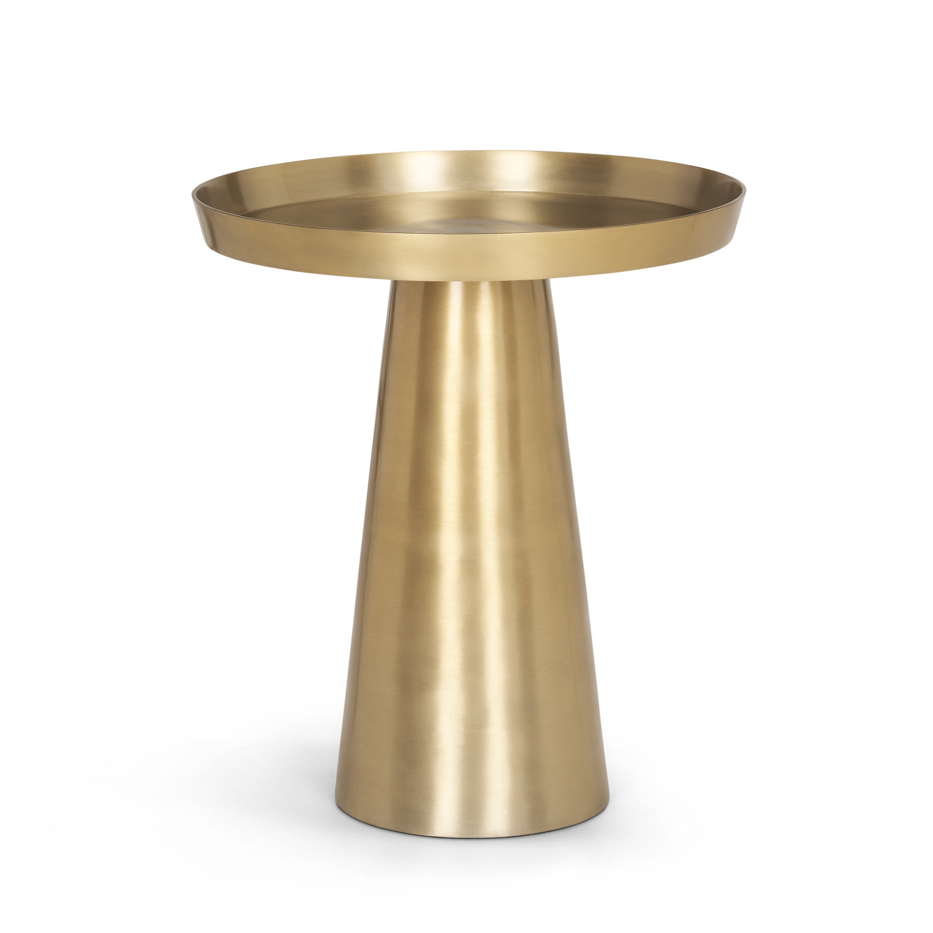 The 18-inch brass and gold iron and metal table is a stylish addition to any living space. Crafted from durable metal, this tray table features a stunning gold finish that exudes modern elegance. The top surface, made of iron in a rich brass color, adds a touch of sophistication while providing a sturdy area for serving drinks or displaying decor. Its removable serving tray makes it versatile and functional for various occasions. Perfect for compact spaces, this table combines practicality with aesthetic appeal, making it an excellent choice for both casual and formal settings. Elevate your home decor with this chic and functional piece that seamlessly blends style and utility. 20.75-inch h x 18-inch w x 18-inch d.
