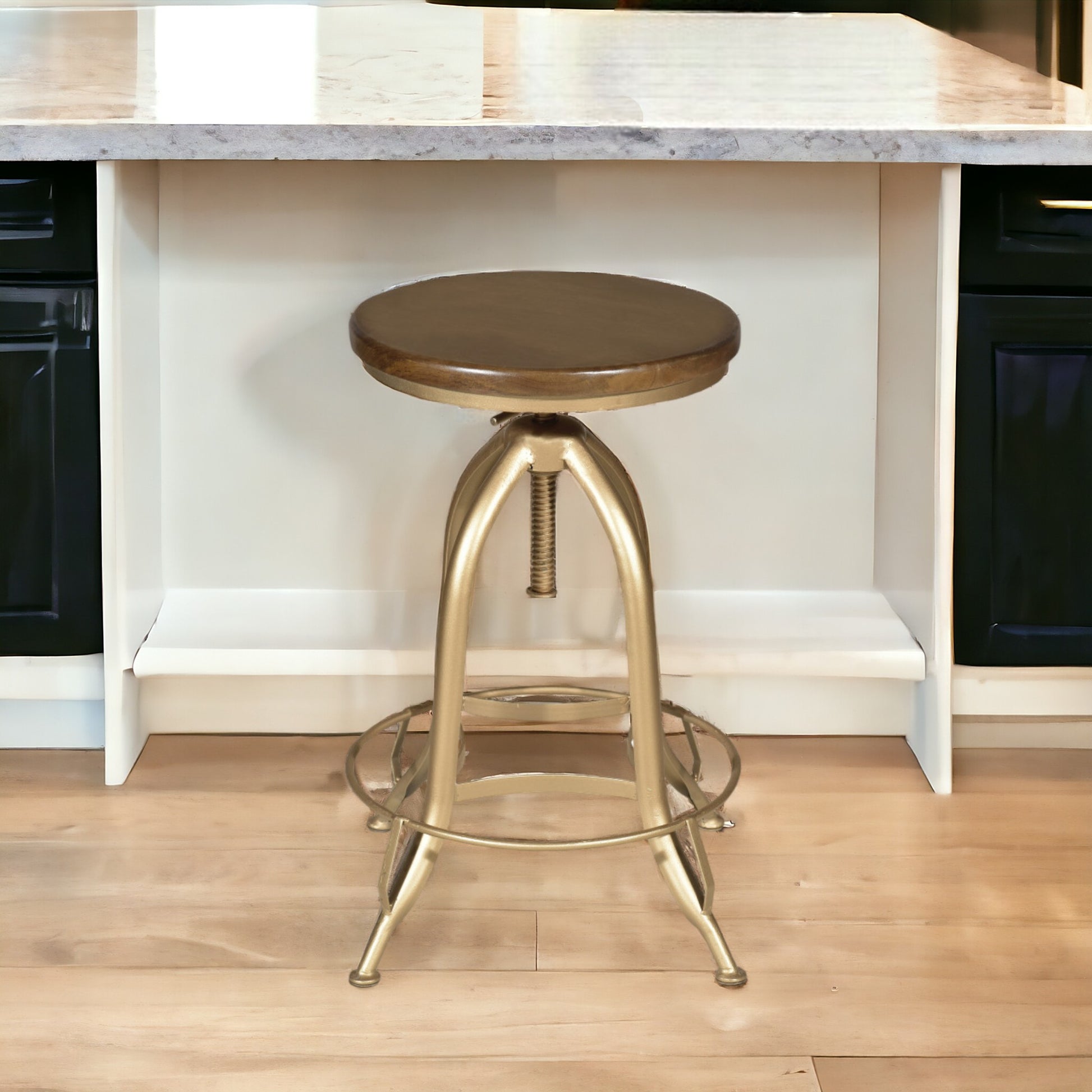 This 30" brown and gold swivel backless adjustable height bar chair with footrest will be the perfect way to add some cool design and utility to your space similar to what you find in your favorite cafes or pubs. The brown solid wood seat of this stool is a nice contrast to the high quality, gold steel of the base. Designed to be good looking and practical, this backless bar chair features a round shaped seat. Designed with a footrest for comfort and convenience. 30" H x 16" W x 16.5" D