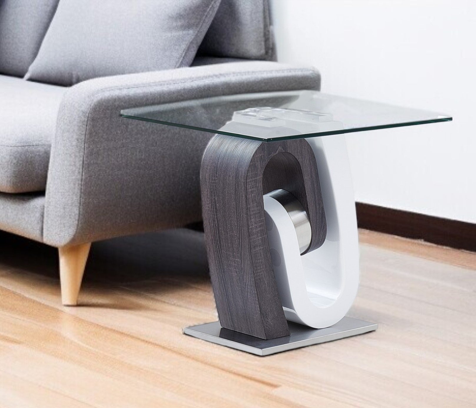 Show off your exquisite taste with this 23-inch white gray and clear glass and wood square pedestal end table. A unique contemporary shaped white and gray solid and manufactured wood frame is finished off with a clear glass top that is the epitome of quality construction and design. An ideal location for placing your snacks and drinks, and a place to keep your lamp, frames, or other accessories. You can also use it as an entryway table to hold your keys. 23-inch h x 24-inch w x 24-inch d.