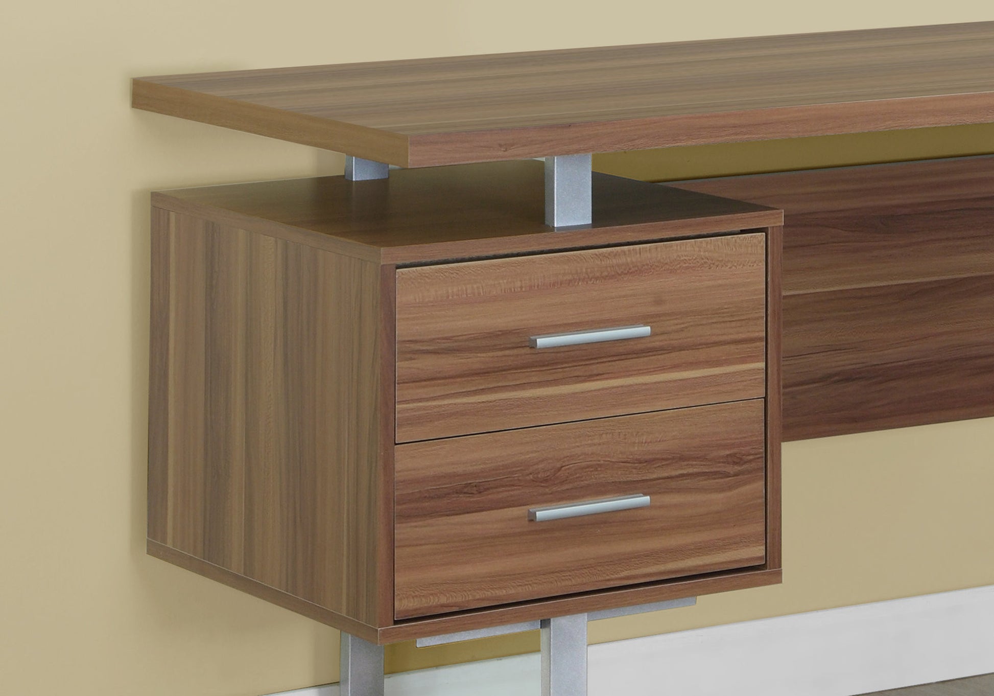 This 24-inch brown and silver computer desk with three drawers will help to turn your office space into an executive suite. Designed to easily fit into most spaces, this classically shaped rectangular desk will turn your room into a productive workspace. Multiple drawers give this desk plenty of hidden storage for your office essentials. Forged with premium craftsmanship and design, this desk is built to last. 30.25-inch H x 23.75-inch W x 60-inch D