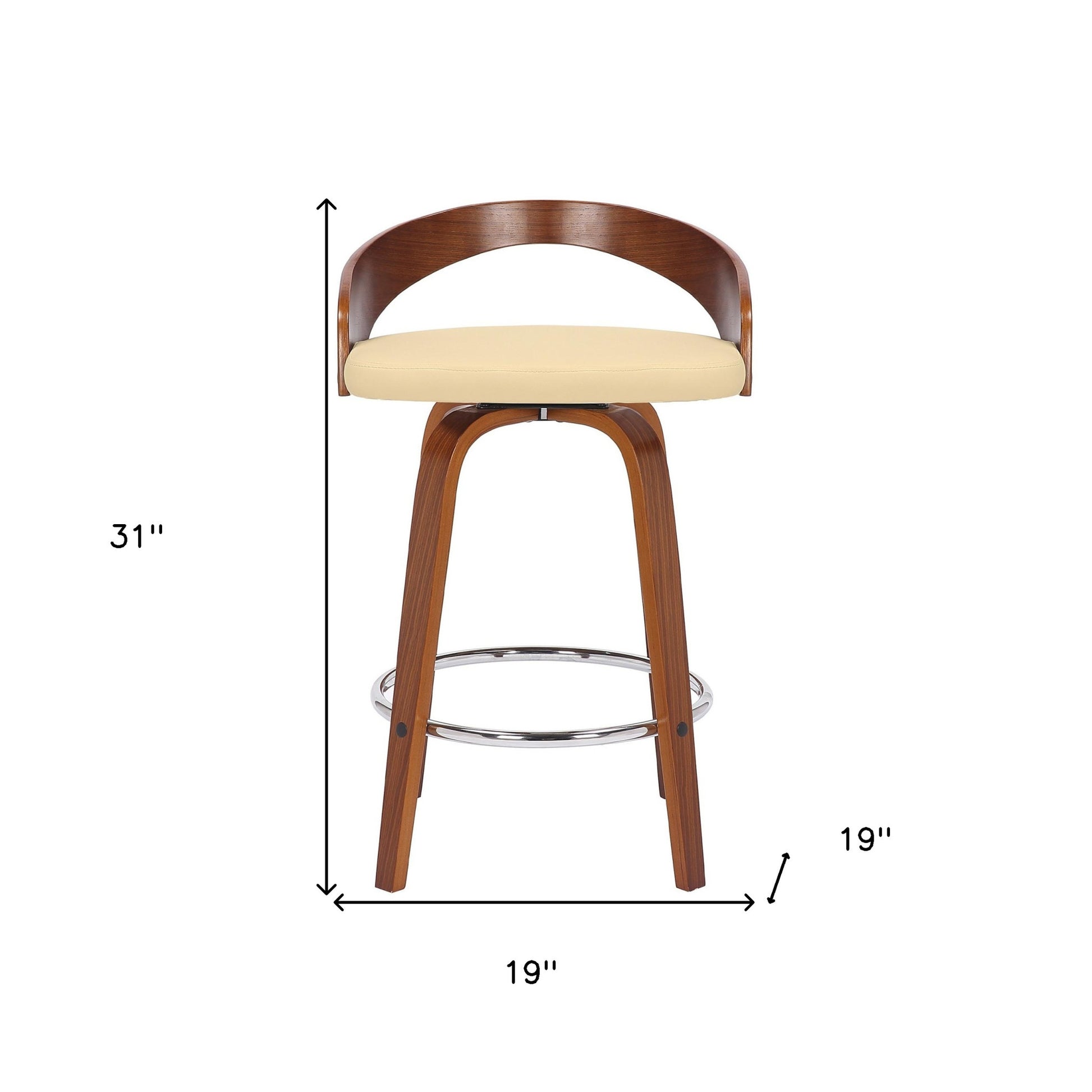 This 26-inch cream and brown faux leather and solid wood low back counter height swivel bar chair will be the perfect way to add some cool design and utility to your space similar to what you find in your favorite cafes or pubs. The cream faux leather seat of this stool is a nice contrast to the high quality, brown solid wood of the base. Not only good looking and stylish, this chair features a round shaped seat and a low back for the ultimate in comfort and enjoyment. A great seating option, this stool will bring a unique look to any room. 31-inch H x 19-inch W x 19-inch D