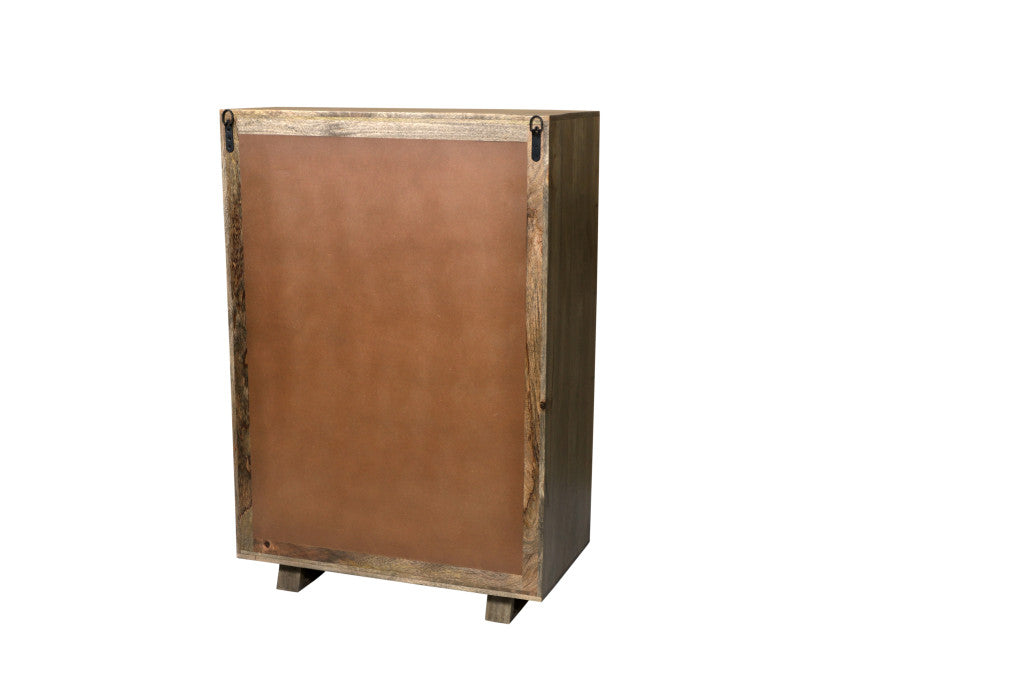 Add personality to your bedroom style and a feeling of coziness with this 35-inch brown carved geometric solid wood five drawer dresser. This vertical standard dresser has a convenient and wide top area for your getting ready needs and supplies. Equipped with five easy open drawers for practical and good looking clothing storage. This dresser is built to last from high quality solid mango wood in a rustic multi-tonal and textural finish. 52.00-inch h x 35.00-inch w x 18.00-inch d.