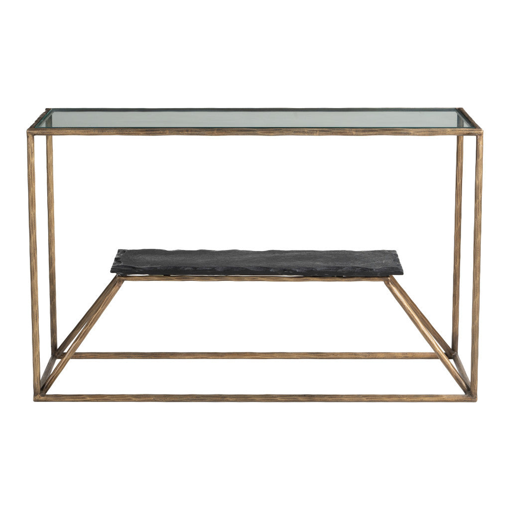 48" Clear and Brass Glass Iron and Stone Frame Console Table With Shelf
