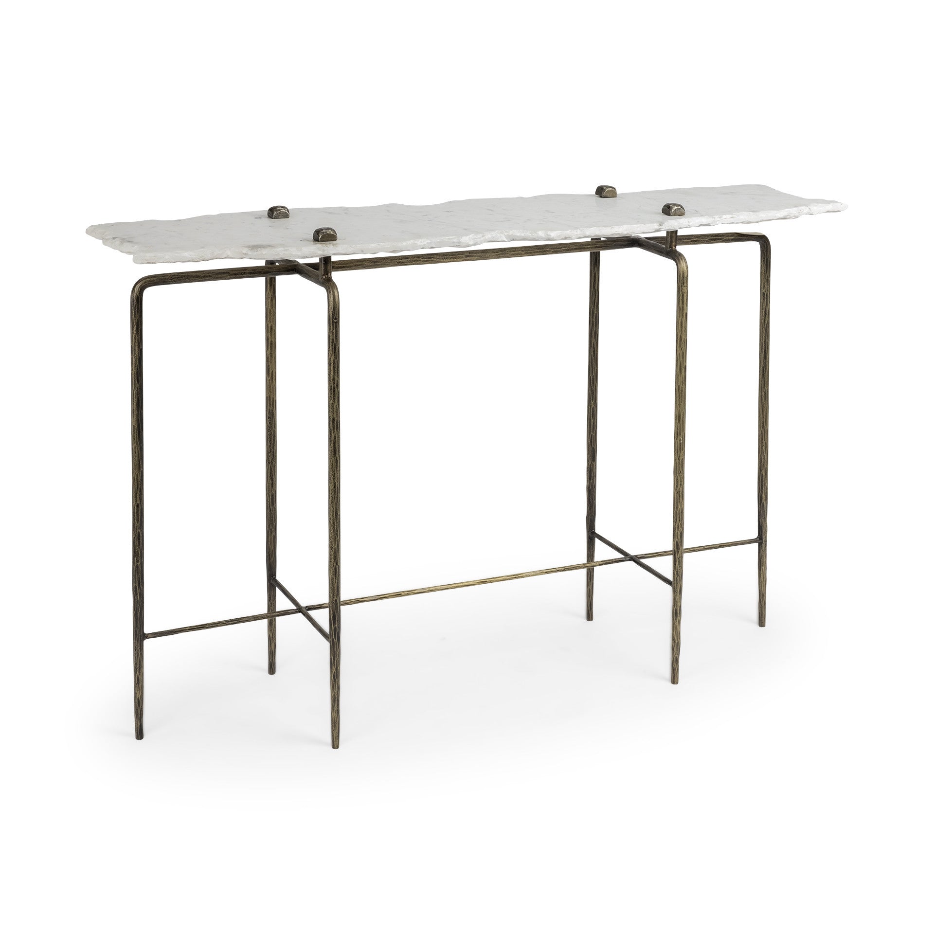 This 49-inch white and brass genuine marble and iron distressed six leg console table can provide a variety of practical functions such as providing extra storage space, serving as a display area for decorative items or acting as a catch-all for keys, mail, and other small items. This versatile table has a genuine marble top with a artisanal live edge and antiqued gold finish metal legs that bring an organic sense of style to your space. The white top of this genuine marble table will add beauty to any room with its alluring and distinctive veining of the stone. Versatile in use, console tables can be used for a variety of purposes in a variety of rooms and settings. 32-inch h x 49-inch w x 17-inch d.