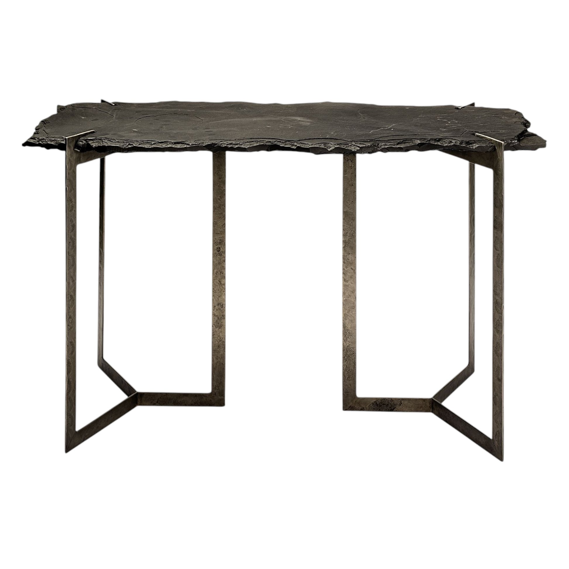 This 20-inch black and nickel slate and iron live edge double pedestal console table can provide a variety of practical functions such as providing extra storage space, serving as a display area for decorative items or acting as a catch-all for keys, mail, and other small items. This rectangular table has clean lines and plenty of surface area. This console table has a top made of black slate, a material that is resistant to scratches, chips, and heat. It can withstand the wear and tear of daily use, making it a practical choice for a tabletop. In addition to a great top, our console table has a iron double pedestal base, meaning that it is well-built and secure. Ideal for living rooms, bedrooms, home offices, and lounge areas, this console table is not only good looking but multi-functional and practical addition to your space. 30.5-inch h x 50-inch w x 19.5-inch d.
