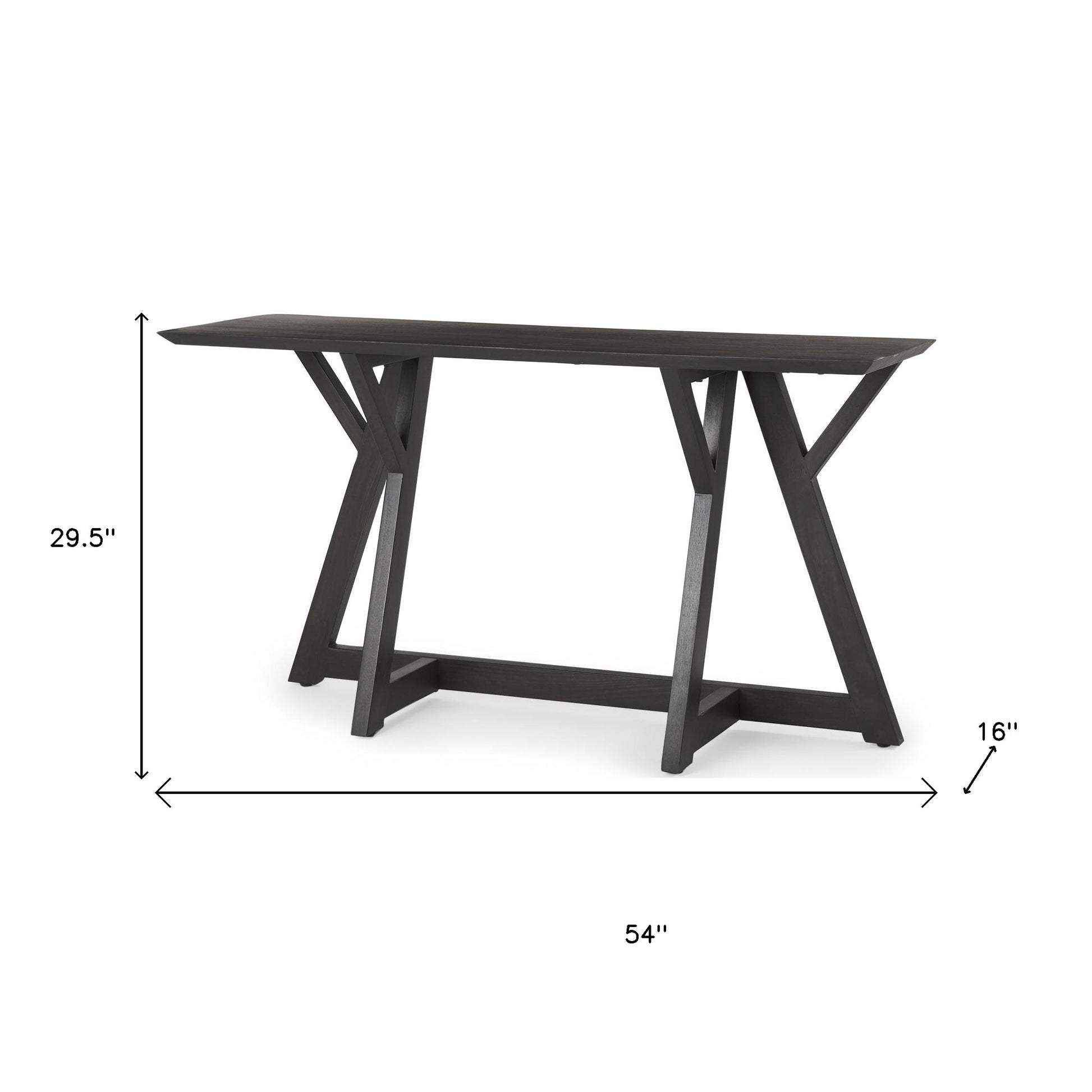 Make a statement in your entryway with our stunning 54-inch brown solid wood trestle console table. This rectangular table is ideal for up against the wall, can free stand in a room, or sit behind the sofa perfectly. The dark brown hardwood table surface makes this unit stand out with its high quality material and construction. The unique geometric base of this unit is crafted with solid wood, leaving you with a console table that is of the finest quality and materials. Ideal for living rooms, bedrooms, home offices, and lounge areas, this console table is not only good looking but multi-functional and practical addition to your space. 29.5-inch h x 54-inch w x 16-inch d.