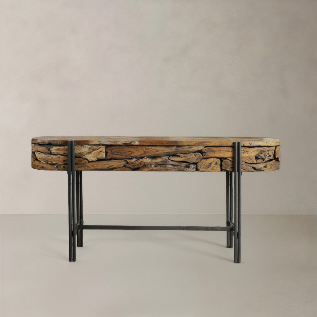 55" Natural and Gunmetal Wood and Metal Distressed Oval Console Table