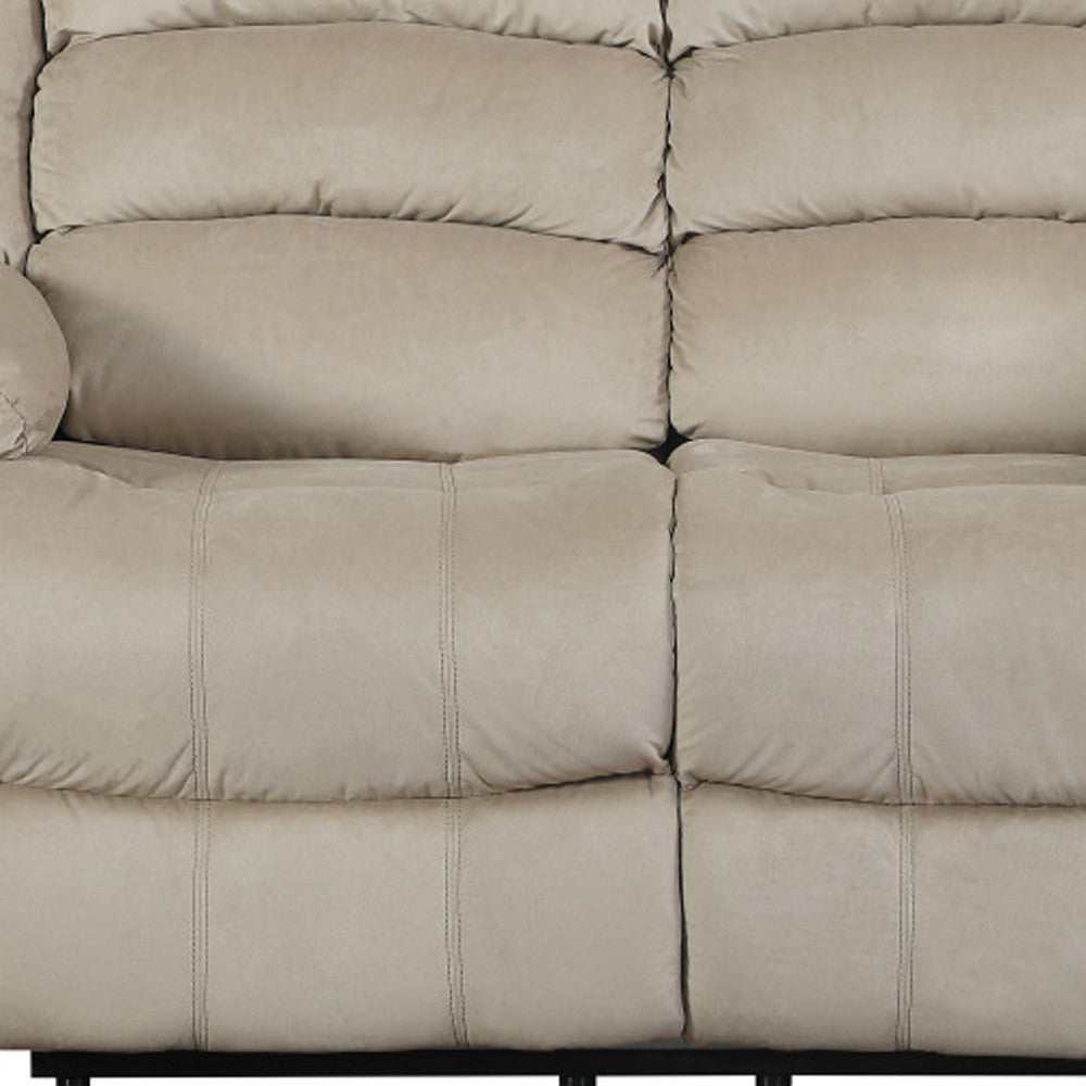 Transform your home's interior with this luxurious 60-inch beige microfiber manual reclining love seat. Pillow top arms offer a comfy place to rest and give this piece some interest and shape. A great showpiece for your room, this sofa is a must-have. The love seat design allows for ultimate relaxation with its manual reclining feature. The microfiber upholstery material adds a touch of elegance, while the solid beige color complements any decor. The tight back design provides additional support and the pillow top arms add a cozy and stylish touch. With a weight capacity of 500 pounds, this rectangular love seat is both functional and durable. 40-inch H x 60-inch W x 35-inch D