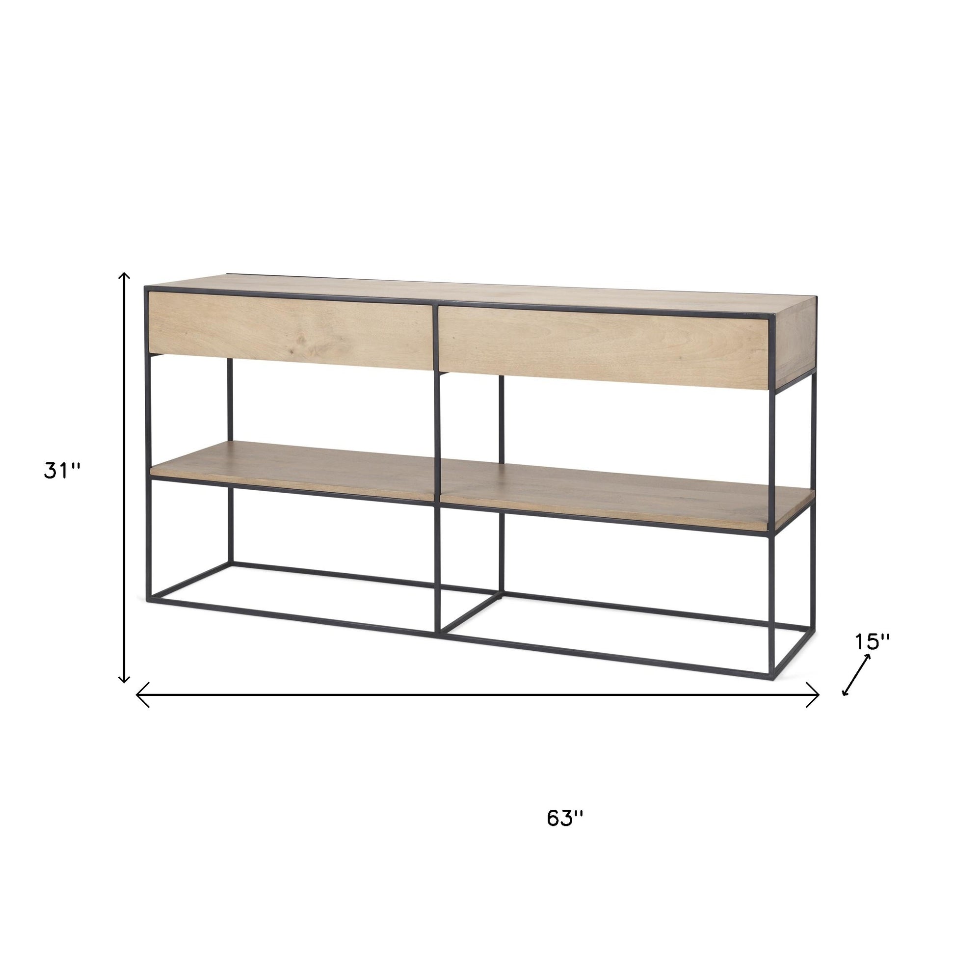 63" Natural and Black Solid Wood and Metal Frame Console Table With Shelf And With Two Drawers