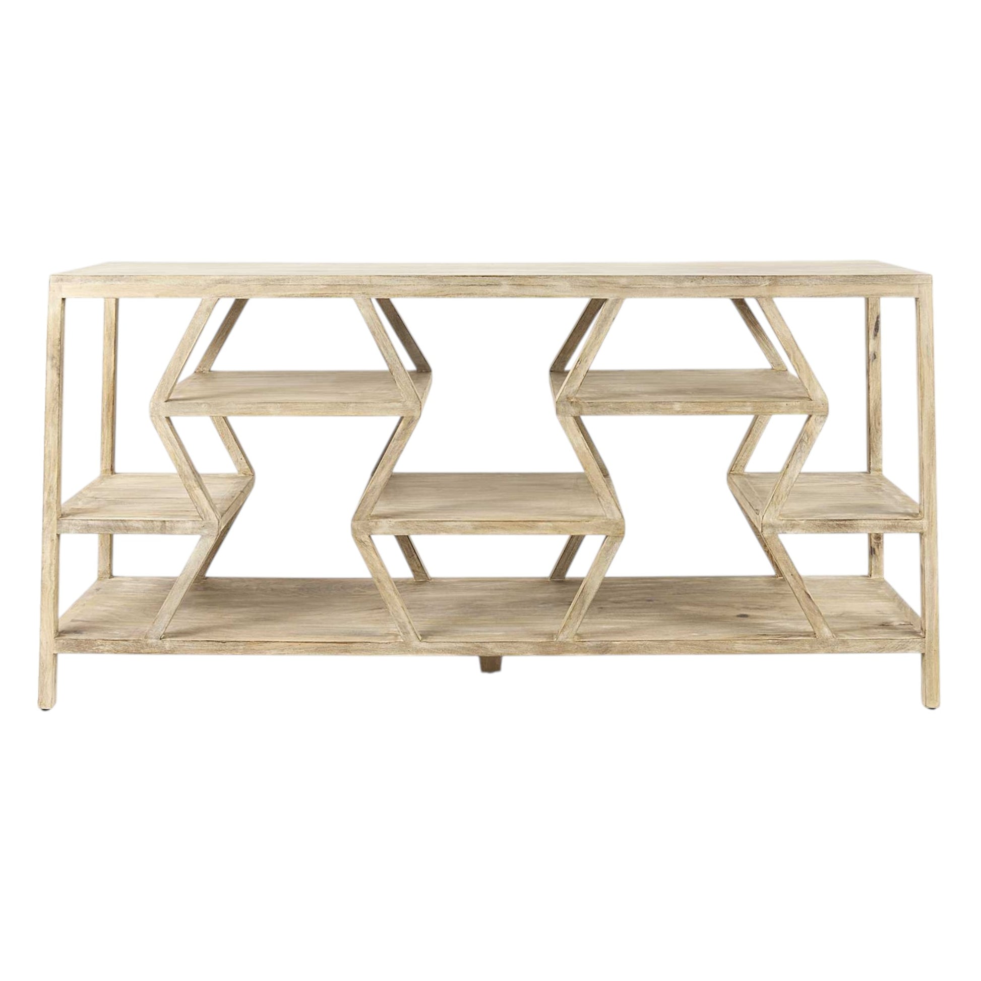 Transform your home with our elegant and versatile 66-inch light brown solid wood console table geometric shelves. Don't miss out on the perfect finishing touch for your home. This rectangular table is ideal for up against the wall, can free stand in a room, or sit behind the sofa perfectly. This hand-crafted design features solid mango wood and a unique multi-level geometric design shelving array that will bring a modern rustic vibe to your space. Ideal for living rooms, bedrooms, home offices, and lounge areas, this console table is not only good looking but multi-functional and practical. 32-inch h x 66-inch w x 16-inch d.