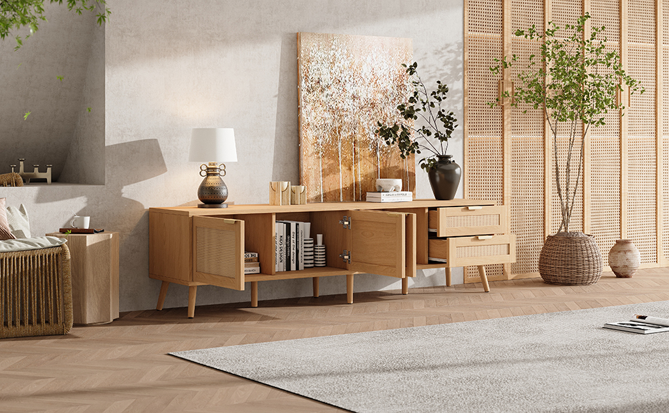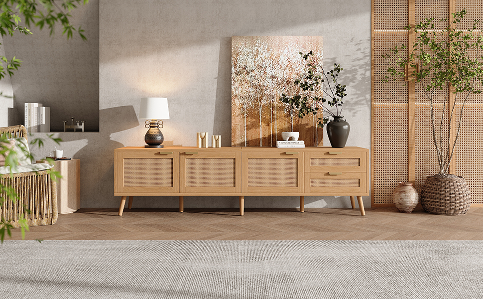 Product Name:70inch Modern TV Stand with Rattan Doors for TVs up to 80", Media Console with Storage Space, 2 Drawers & Cable Holes, Entertainment Center for Living Room