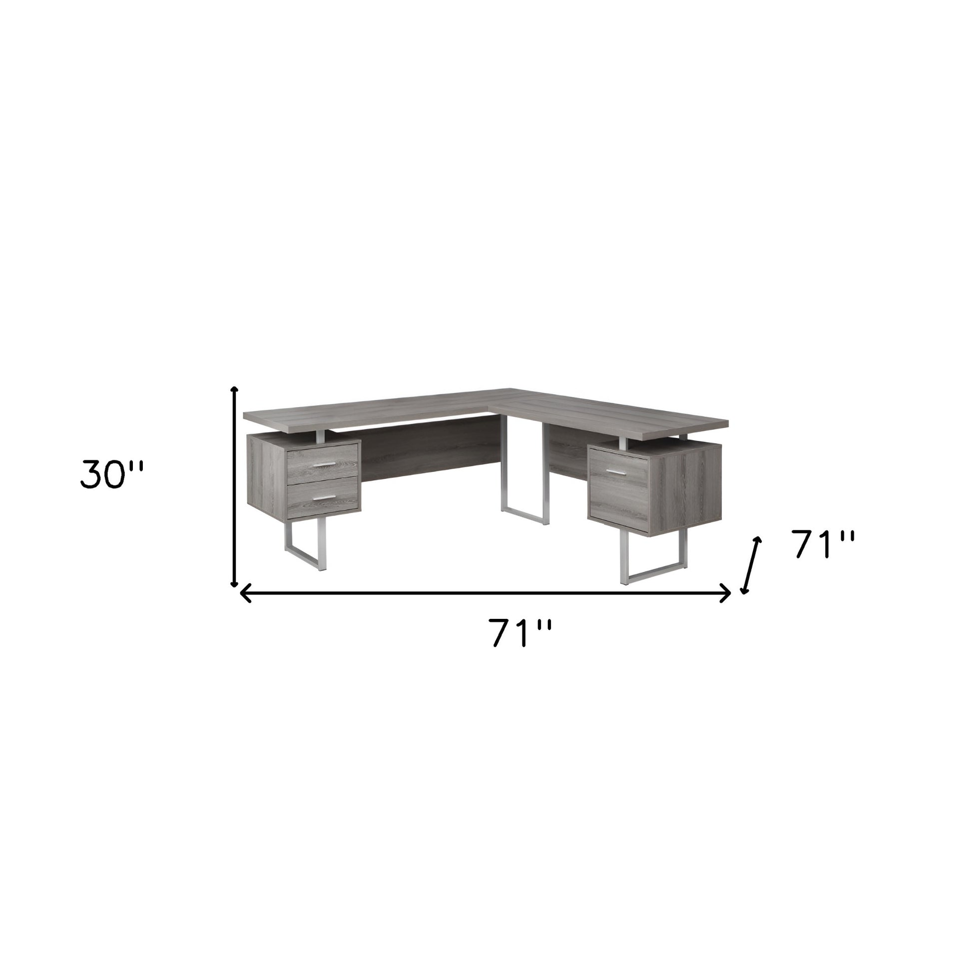 This 71-inch taupe and silver l shape computer desk with three drawers will help to turn your office space into an executive suite. Multiple drawers give this desk plenty of hidden storage for your office essentials. Built to last, this sturdy desk is designed for comfort and efficiency for years to come. 30-inch H x 71-inch W x 71-inch D