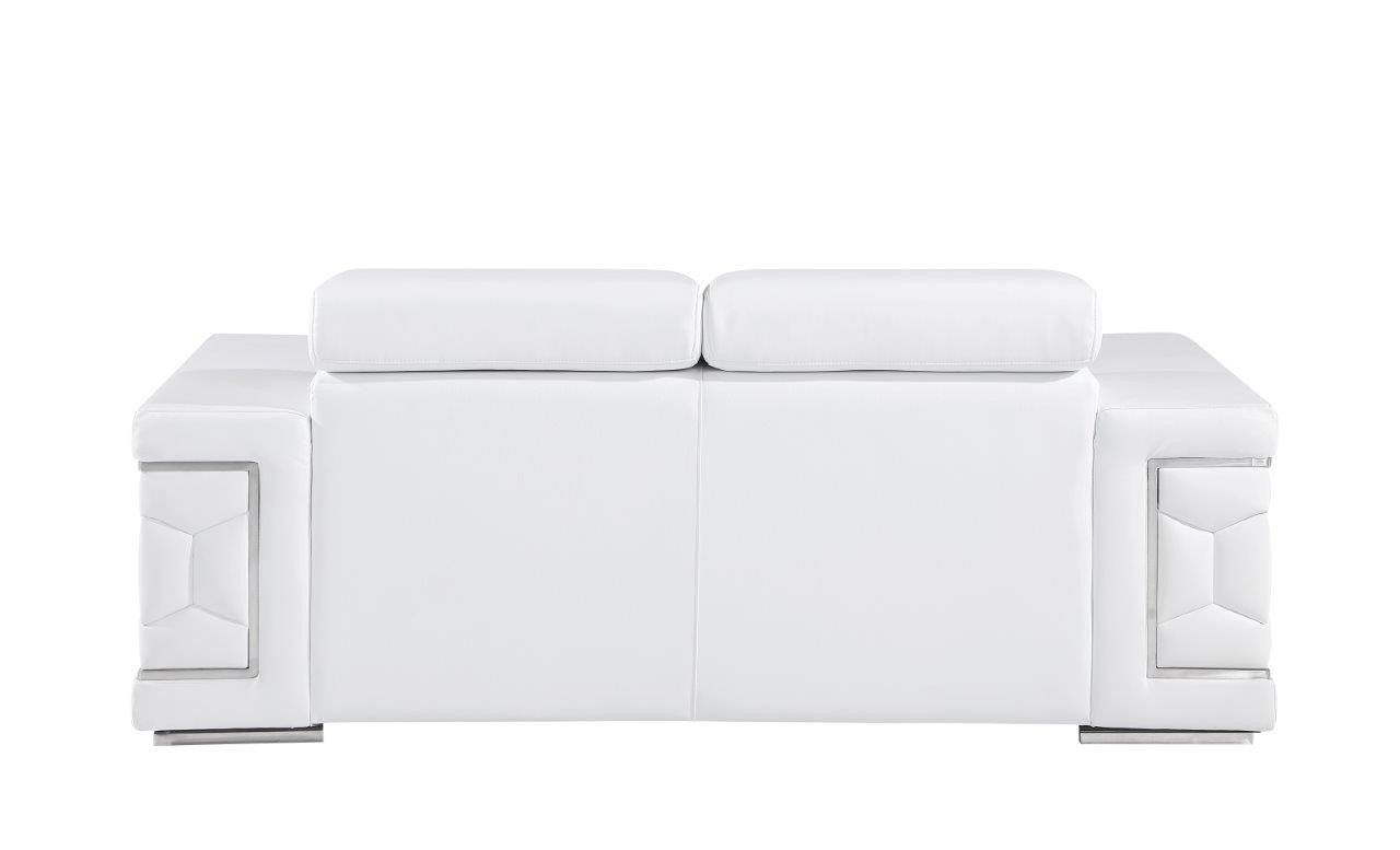 Superior construction from fabulously soft and high grade leather gives this 71-inch white and silver genuine leather love seat a leg up on the competition. The premier grade Italian leather used makes your lounging luxuriously comfortable and adds an elegant appeal to your space. Square arms offer a comfy place to rest and give this piece some interest and shape. Silver steel legs effortlessly elevate the room and add a touch of contemporary design. A great showpiece for your room, this sofa is a must have. 29-inch H x 71-inch W x 41-inch D