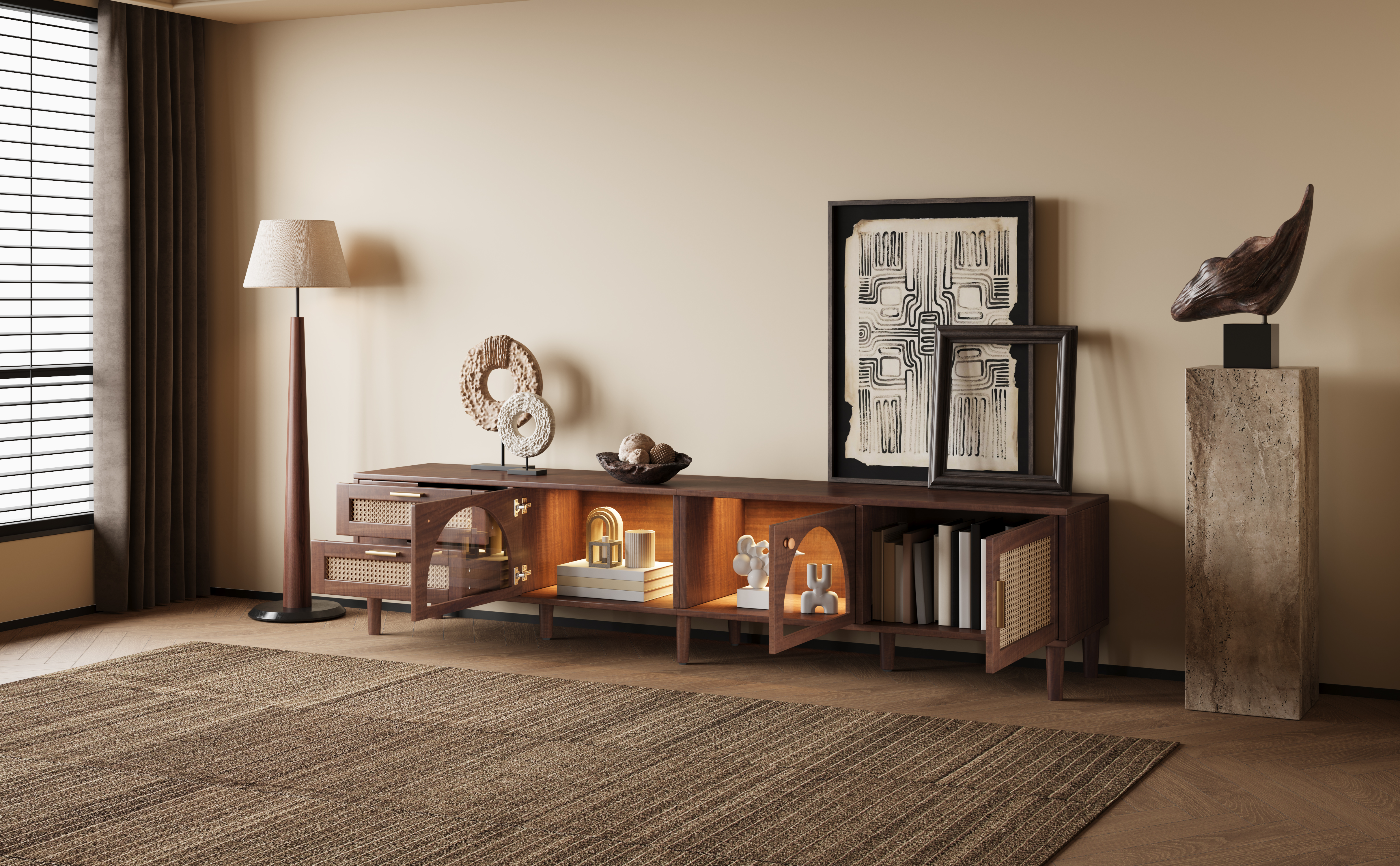 - [Rattan Design] Elevate your living room with the unique, natural texture of our rattan design. The woven rattan doors introduce an airy lightness and organic charm that is both modern and timeless. It’s the perfect way to add character and a touch of nature to your home.