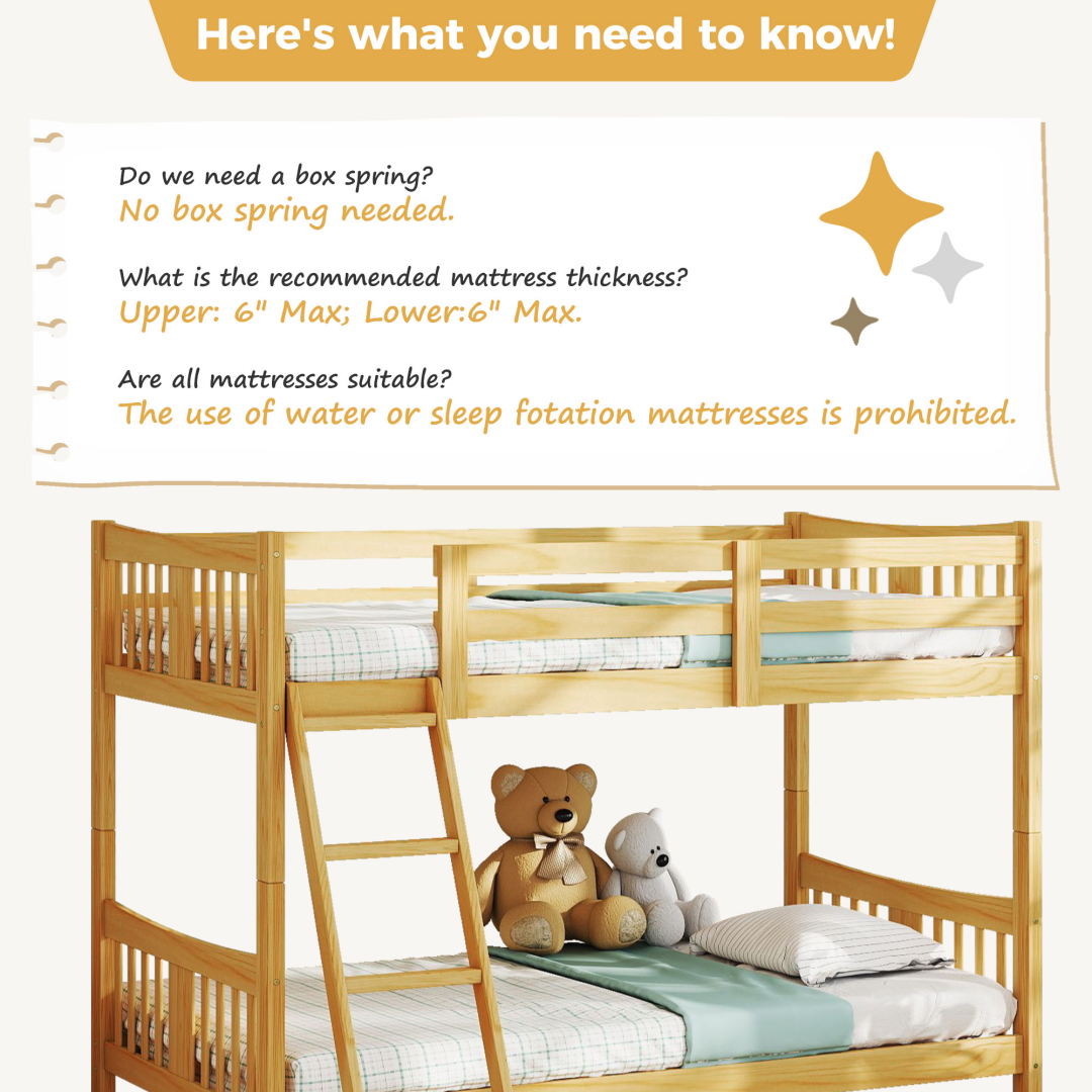 PineDimensions Package Dimensions Product Weight Package Weight Product Code Style 80.31 x 15.94 x 5.51 inch 80.31 x 15.94 x 5.51 inch 80.46 lb 80.46 lb ZHUMI-MCJ-SZB01-TOT-WD-A A 41.92 x 19.29 x 8.26 inch 41.92 x 19.29 x 8.26 inch 73.19 lb 73.19 lb ZHUMI-MCJ-SZB01-TOT-WD-B B - Twin Over Twin Bunk Bed: This versatile bunk bed is designed to grow with your kids. It easily converts from a space-saving twin-over-twin bunk bed into two standalone twin beds, offering maximum flexibility. It is designed to accommodate any standard twin mattress (sold separately). Some assembly is required.