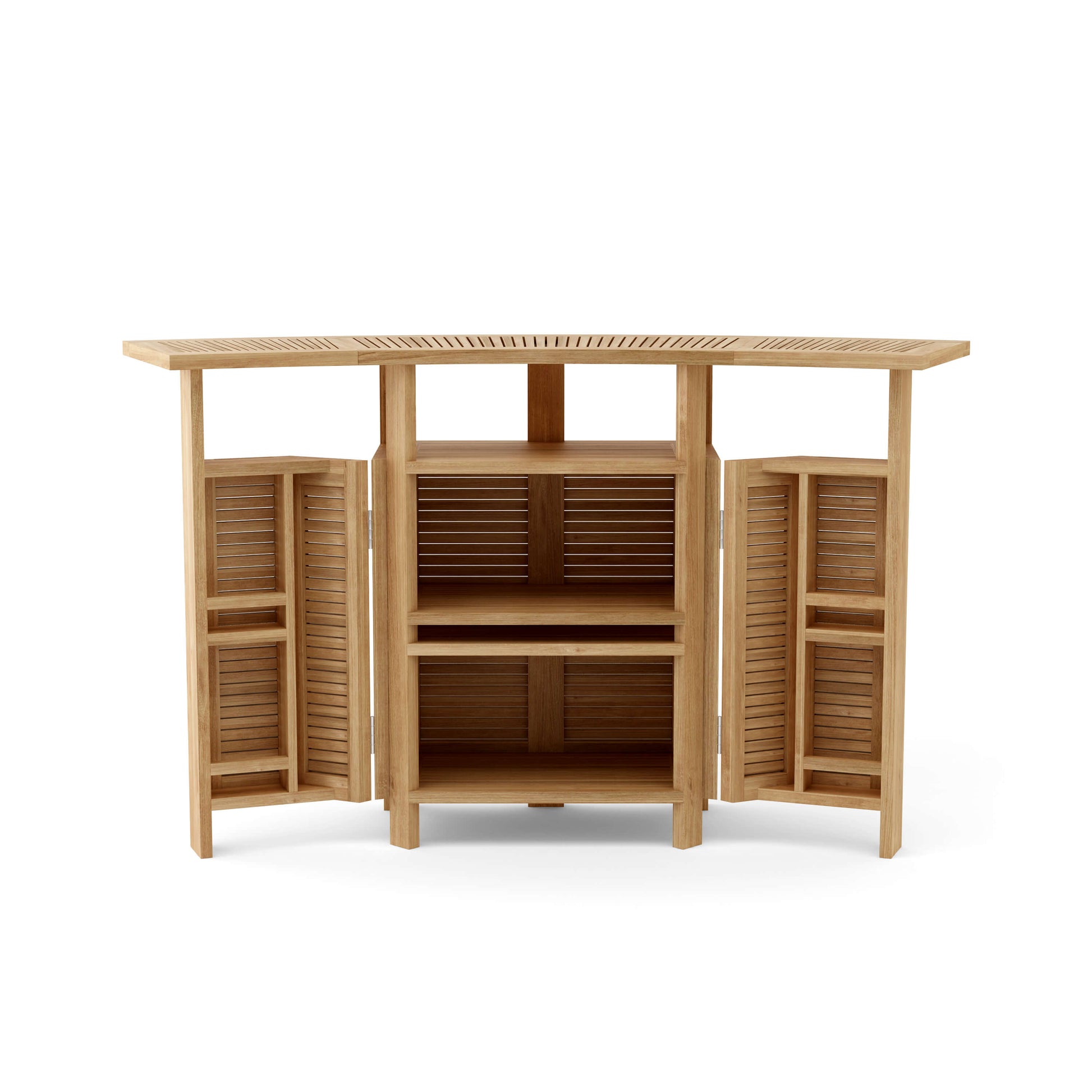 Become the bartender for your next party and gathering with the Altavista 62” Folding Bar Table. Easy for storage, movement, and compact, fold the sides of the bar table to open, letting your patrons know the bar is open for business, and easily fold close again for easy storage when not in use. The refreshing poolside bar table under the sun, this table comes with plenty of room to store your favorite drinks, bottles, and glasses. Mix and match additional teak bar chairs from our numerous Bar Chairs collection to achieve your ideal bar set. Seats up to 4-6 people comfortably. Built from Premium A-Grade Teak sanded smooth unfinished, the perfect outdoor bar table for the job.