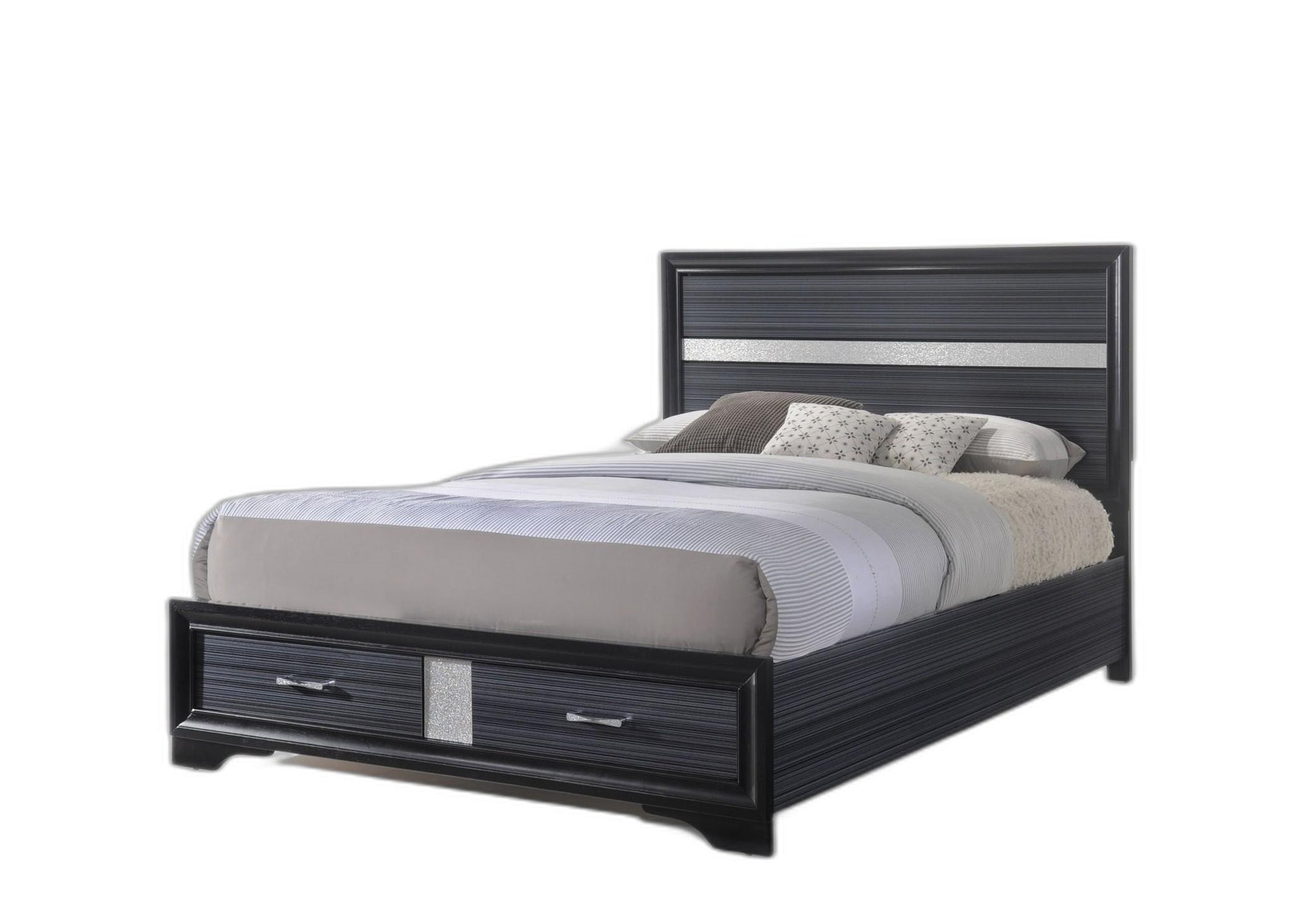 The black and gray wood queen with two drawers bed frame is the ultimate combination of comfort and style. Quality craftsmanship in every facet of production ensures durability and long-lasting wear. Contemporary styling includes a striking black finish with sparkling gray faux crystal insets. This bed is the perfect way to make your bedroom comfortable and inviting. 50-inch h x 63-inch w x 84-inch d.