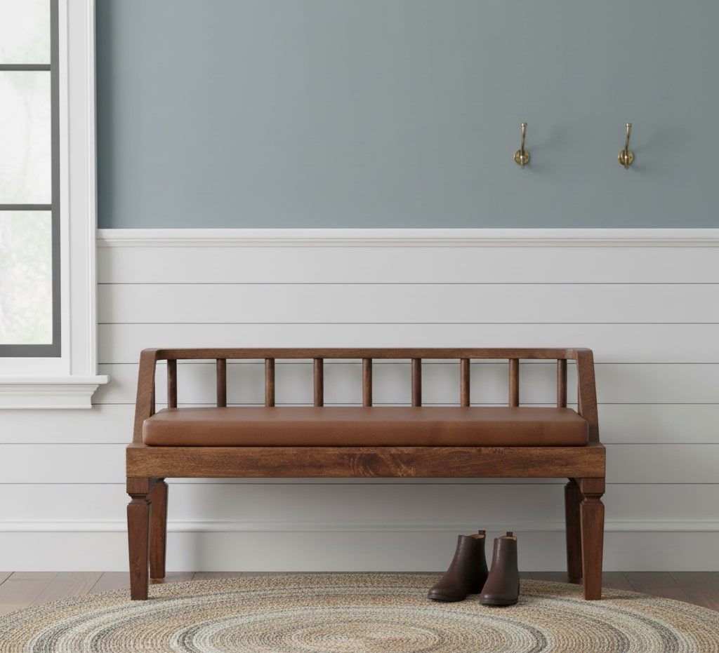 The Bordeaux Leather Bench combines rustic warmth with modern simplicity. Handcrafted from solid mango wood in a soft roasted almond finish, it is topped with a rich brown leather cushion that adds comfort and timeless charm. Its clean lines and gently tapered legs give it a versatile character, making it equally suited for entryways, living rooms, or at the foot of the bed. This piece balances natural textures with understated elegance, creating a seating solution that is as functional as it is refined.