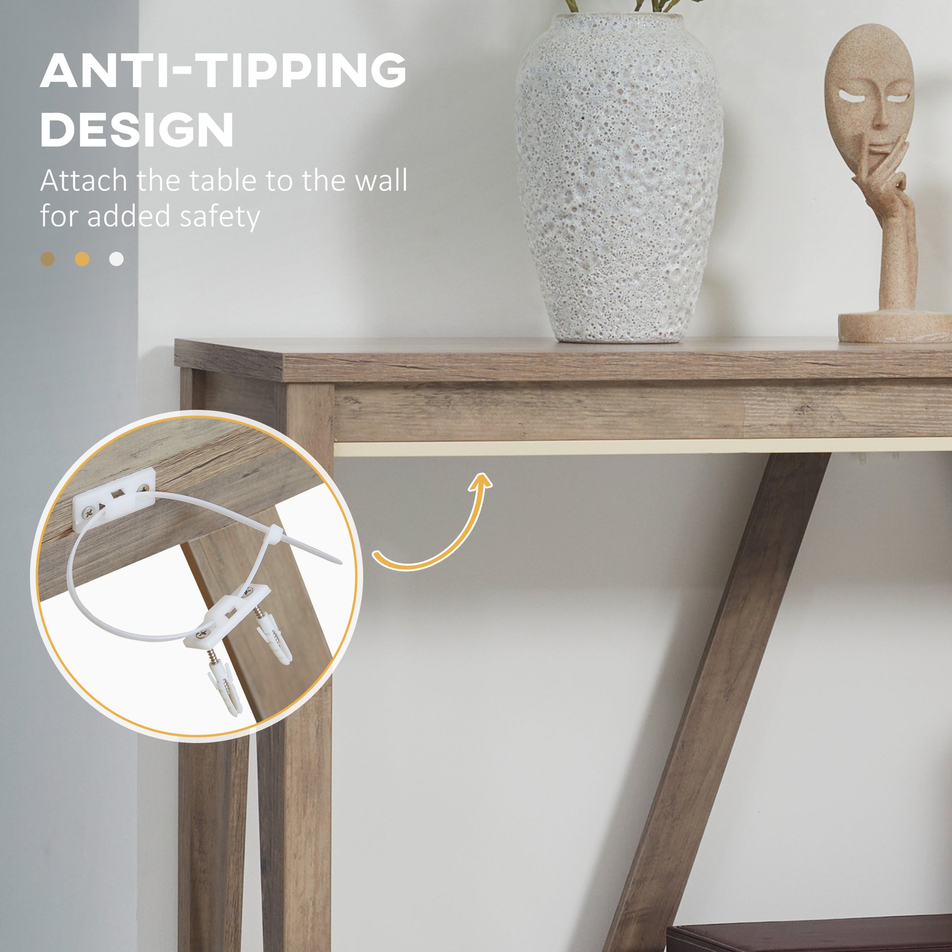 - - Anti-tipping hardware on the back allows you to secure the table to the wall for safety