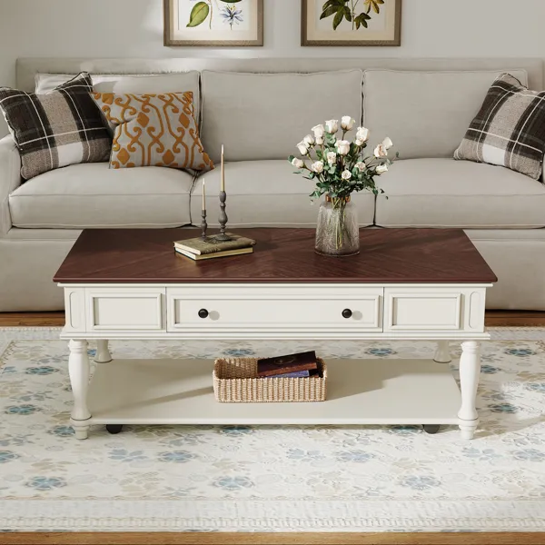 Farmhouse Coffee Table With One Drawer, Easy Assembly, Retro Movable Rectangular Cocktail Table With Lockable Wheels, Country Style Center Table With Solid Wood Legs For Living Room, Walnut+White