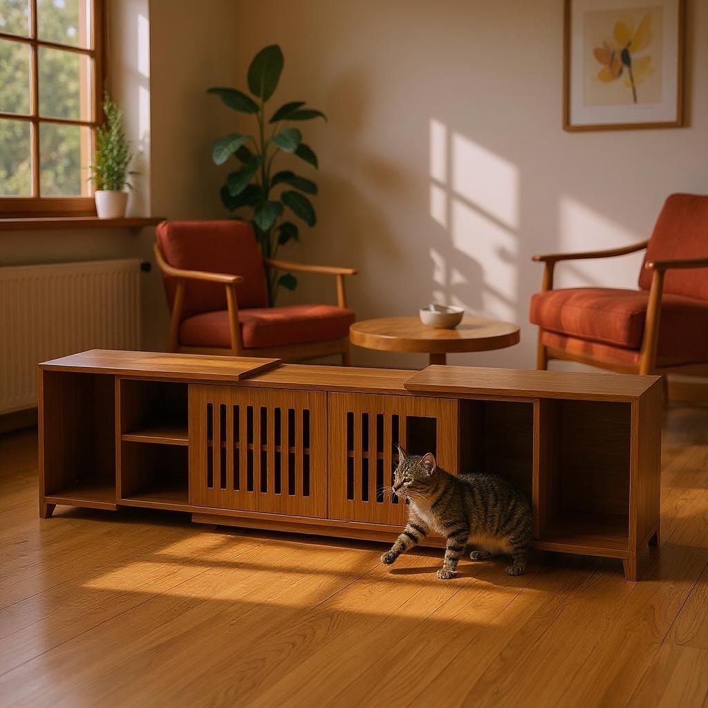- Design & Aesthetics: Boasting a minimalist, natural wood design, this stand blends seamlessly into various home decor styles, from Scandinavian to mid - century modern. The slatted doors add a stylish, airy touch while providing privacy for the cat’s restroom and house. The extendable mechanism is sleek, maintaining the stand’s clean lines whether fully extended or compact. It elevates your entertainment area’s style while integrating pet - friendly features.