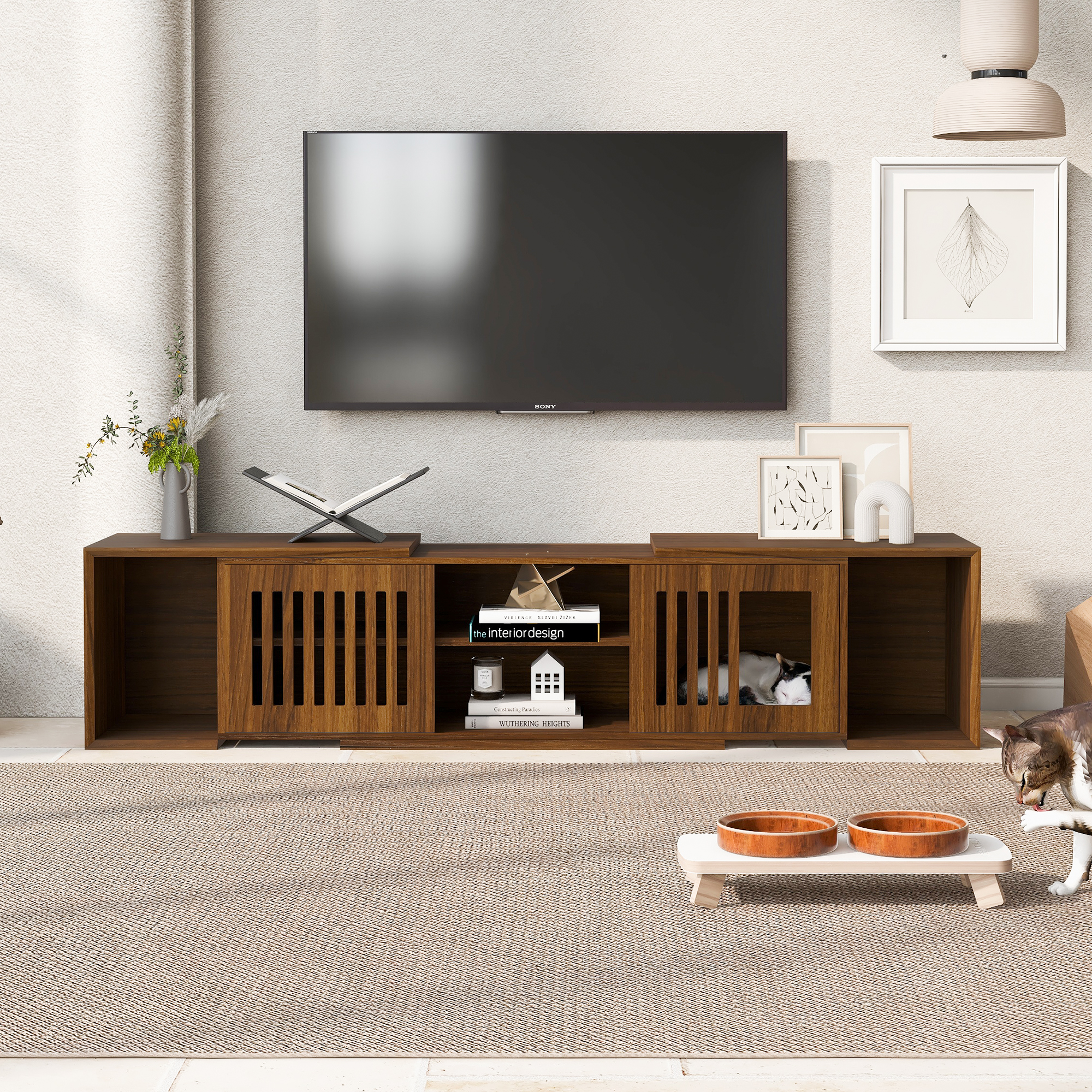 Product Name:Mid-Century Modern 54.3" Extendable TV Stand (up to 100") with Cat House & Litter Box Enclosure – Walnut Wood Entertainment Center, Sliding Doors, Hidden Pet Furniture