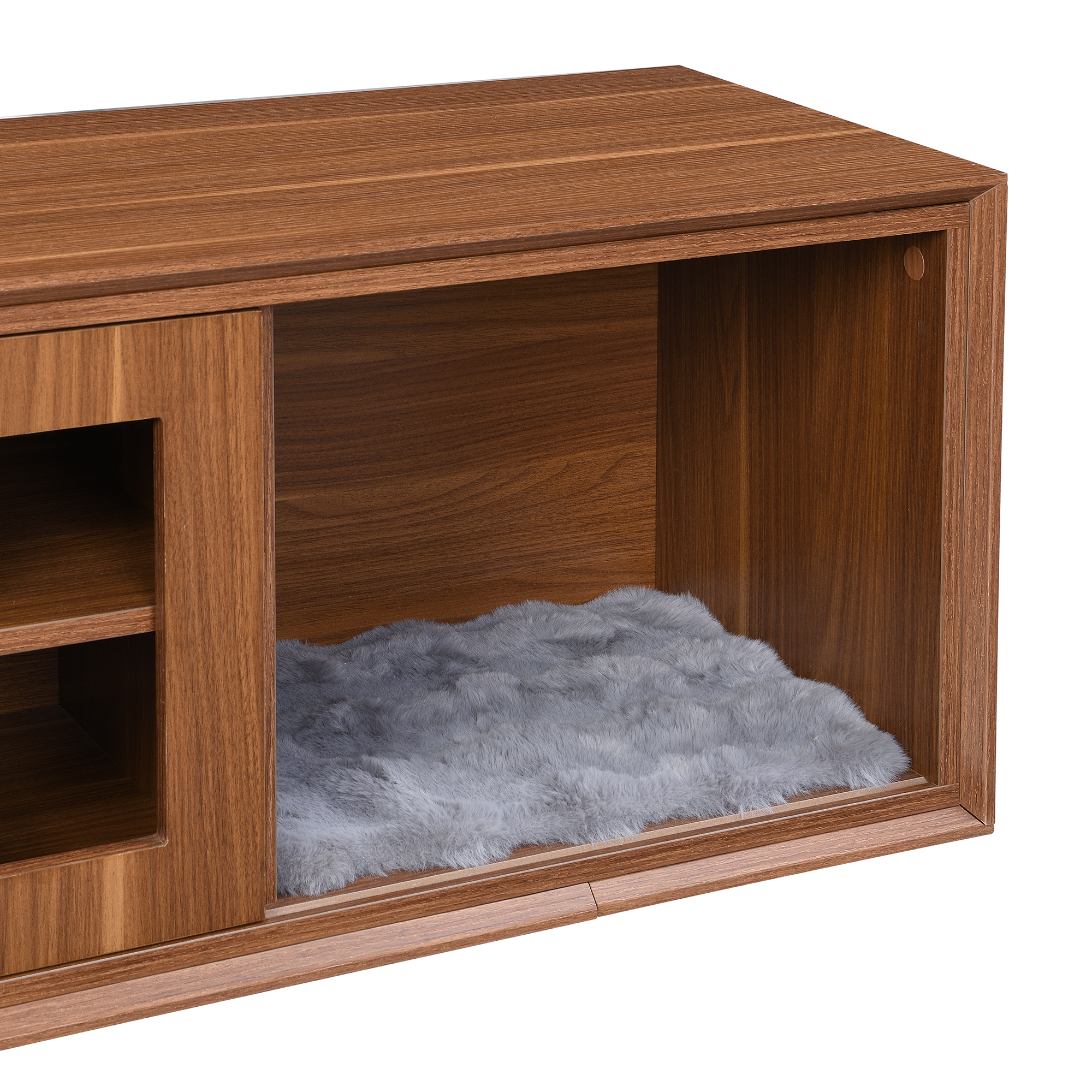 Mid-Century Modern 54.3 Extendable TV Stand Up To With Cat House Litter Box Enclosure Walnut Wood Entertainment Center, Sliding Doors, Hidden Pet Furniture