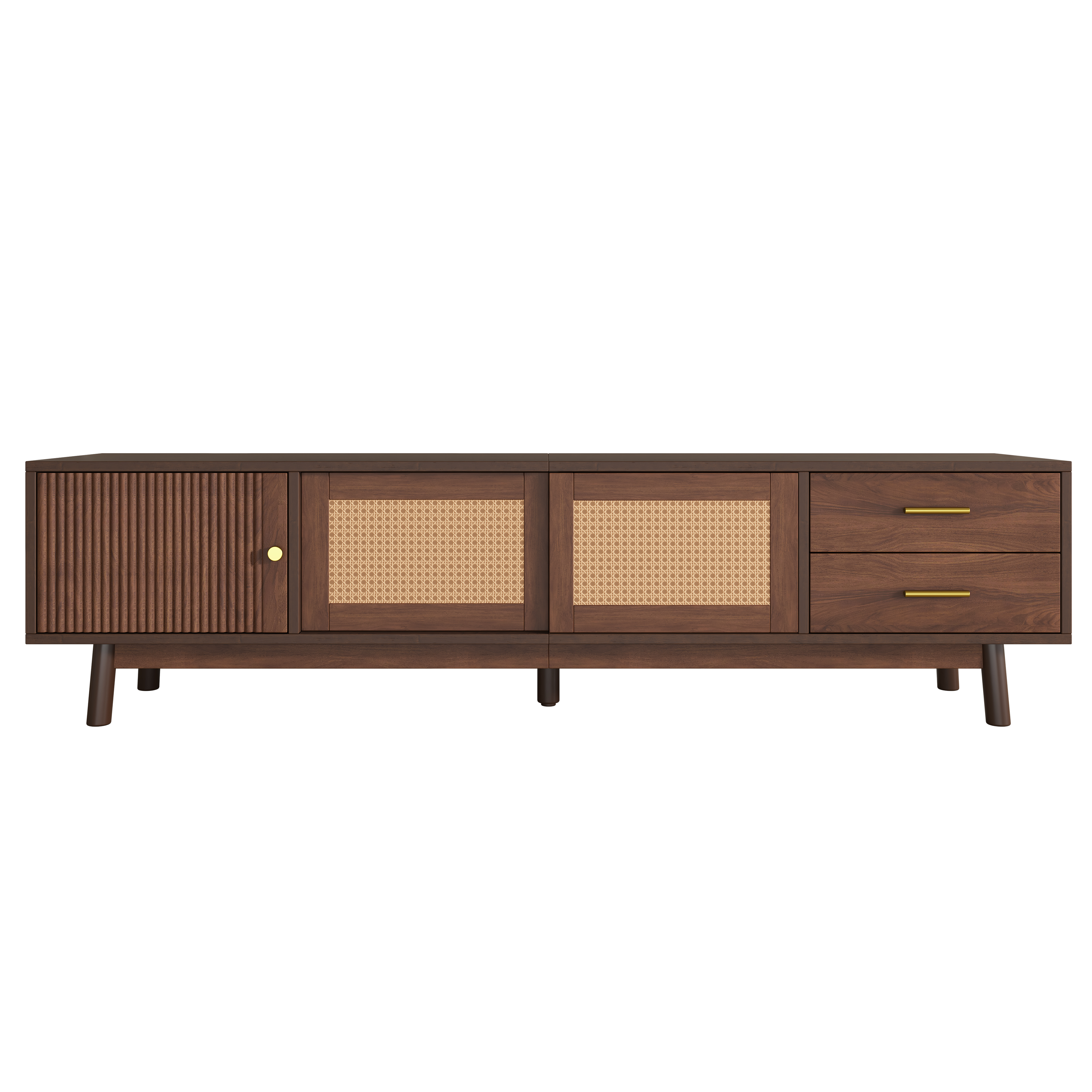- [Elegant Interwoven Rattan Design] The TV stand features a stylish interwoven rattan cabinet, adding a touch of natural elegance to any home decor.