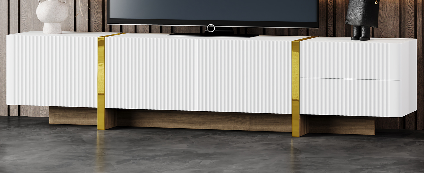 Featuring smooth fluted panels and golden wood grain legs, this TV stand emanates a luxurious elegance that harmoniously complements a wide range of modern furniture styles. It displays a distinctive, three-dimensional, and high-end aesthetic, adding beauty and personalization to any space.