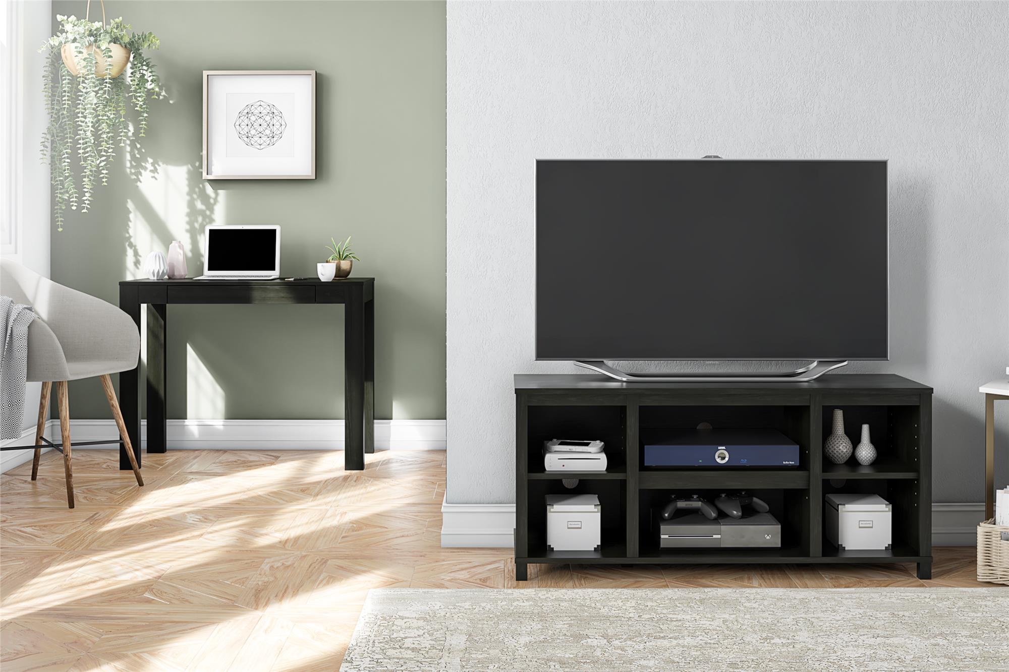 The Parsons TV Stand is just the right size for your flat paneled TV up to 50" wide. This TV Stand has tons of open storage so you can keep your cable box and gaming system in the 2 center shelves and still have room to organize your books, remotes and DVDs on the other 4 shelves. The wire management holes in the back panel keep your cords organized and tangle free. With a laminated particleboard build, the black oak woodgrain finish adds a modern touch to your space. The TV Stand ships flat to your door and requires assembly upon opening. Two adults are recommended to assemble. Once assembled, the TV Stand measures to be 20.875"H x 45.375"W x 15.75"D.