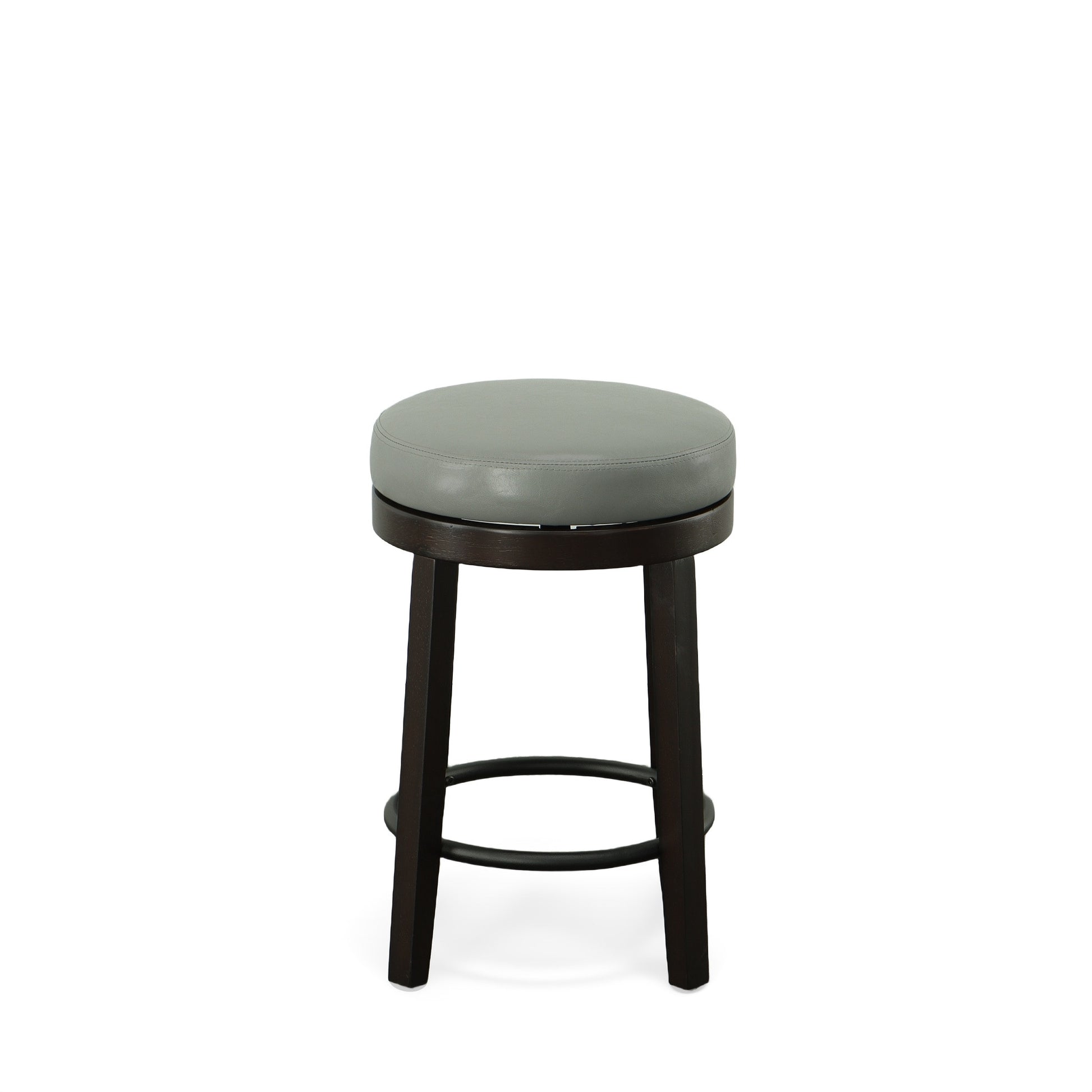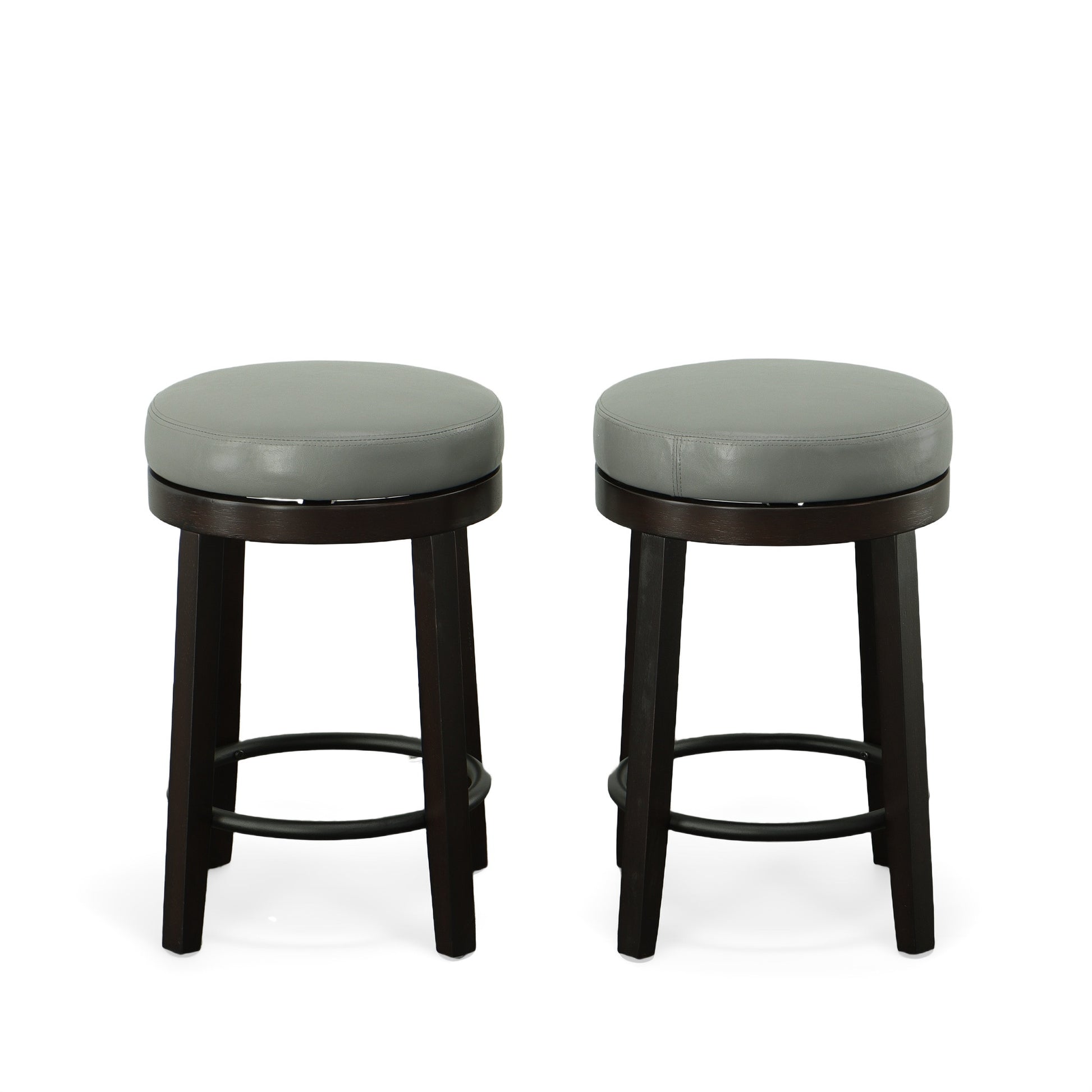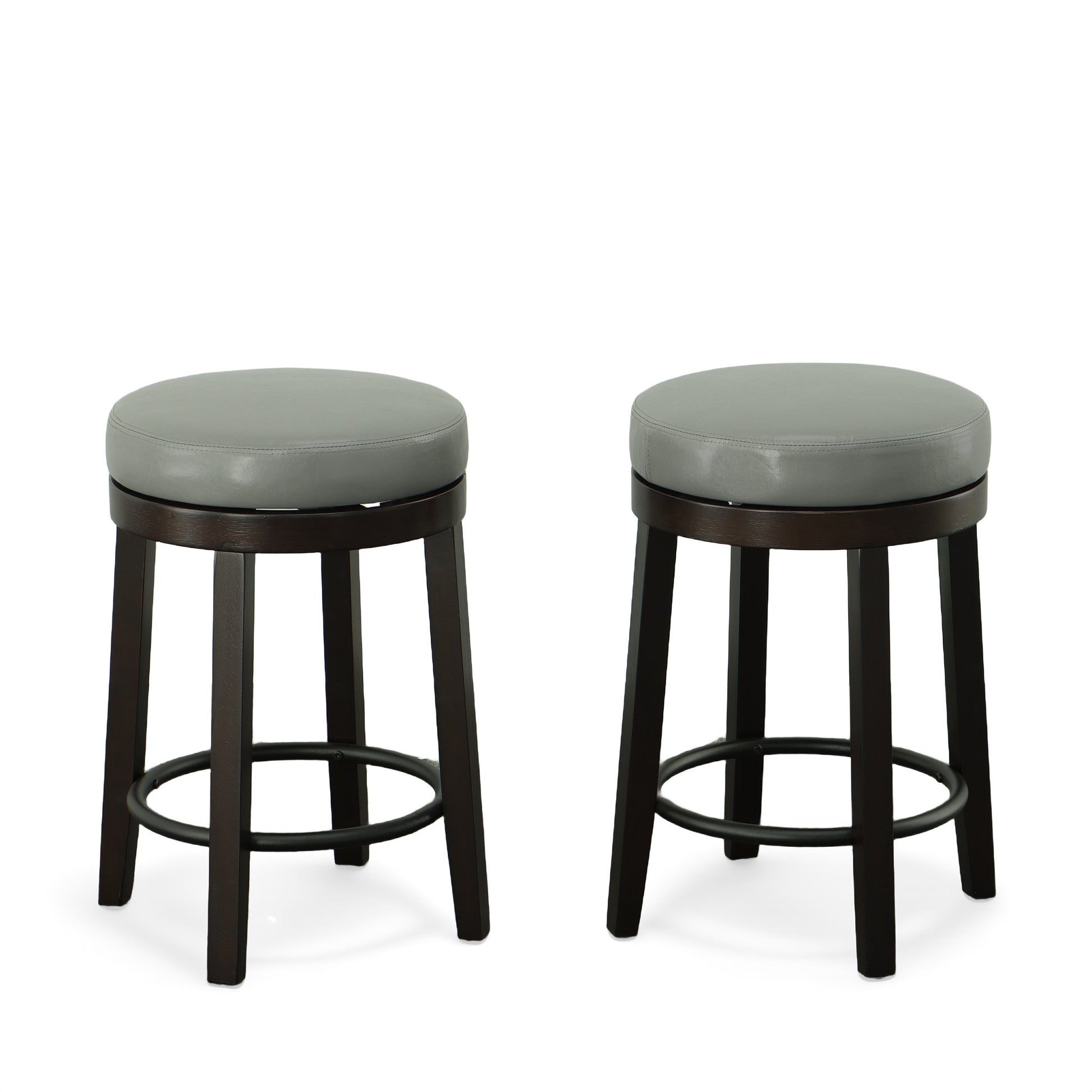 Comfort and design come together nicely in this set of two 24-inch gray and espresso faux leather and solid wood backless counter height swivel bar chairs. The base of this stool is made from solid wood in a espresso color that is a nice contrast to the gray faux leather seat. Designed to be good looking and practical, this backless bar chair features a round shaped seat. Designed with a footrest for comfort and convenience. 24-inch h x 17-inch w x 17-inch d.