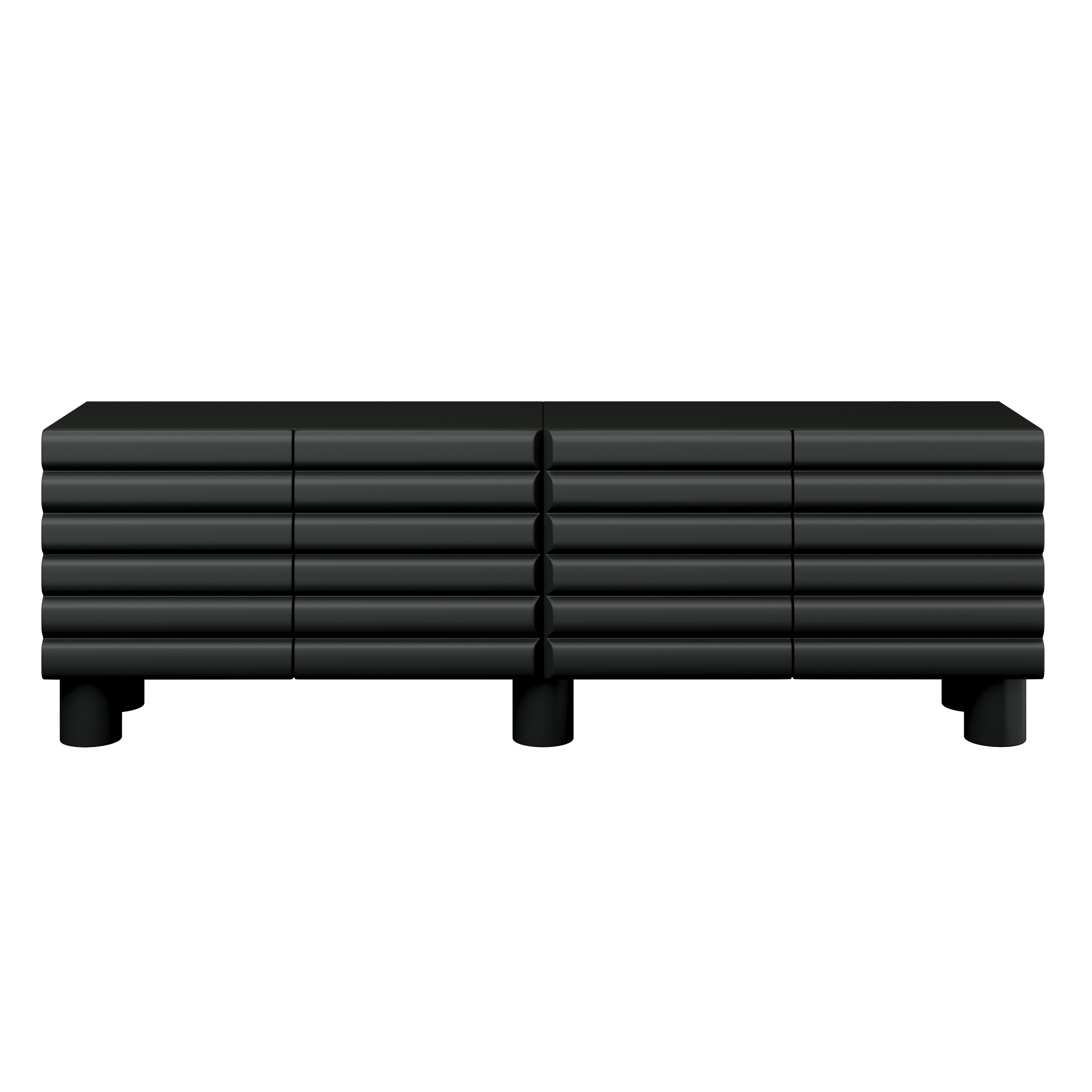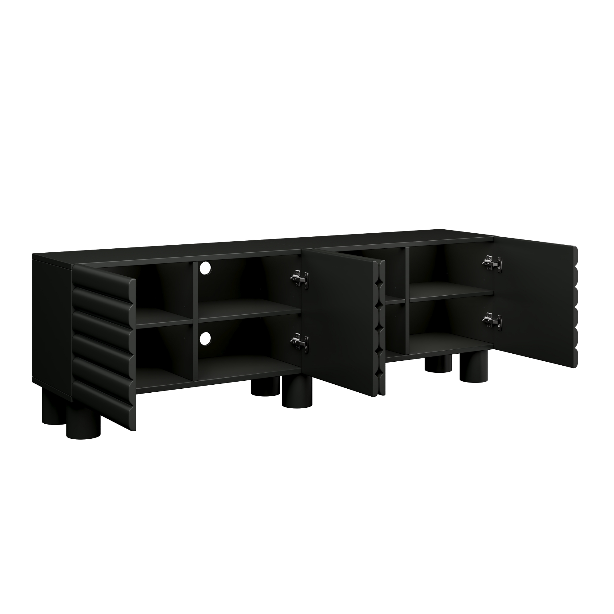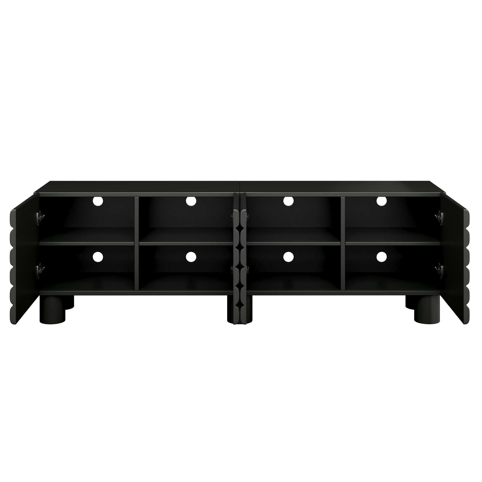 Stylish Thick Wavy Door TV Cabinet With Adjustable Shelves, Cream Style TV Stand With 4 Cabinets For TVs Up To 75 Solid Media Console With Cylindrical Legs And Cable Holes For Living Room, Black