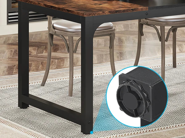 【Durable and Sturdy】: Built with 2'' by 2'' strong metal frame and a 0.59'' thickened board, this rectangular dining table is designed to withstand the test of time and can handle the weight of multiple dishes and drinks. The adjustable foot pads to help level it on uneven surfaces, ensuring stability during meals.
