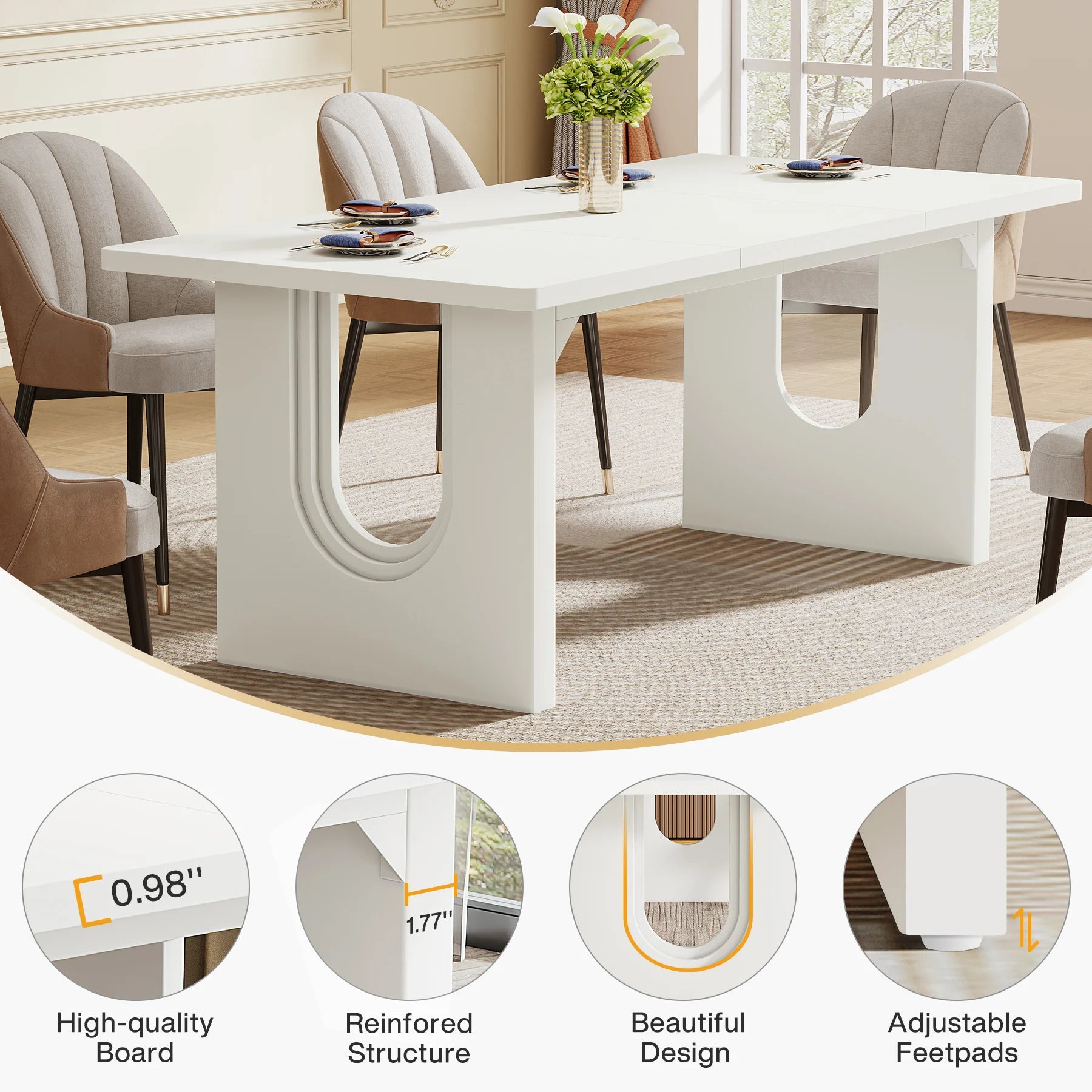 【Durable and Stable】 This wood dining table is crafted from high-grade MDF, easy to clean, and resists scratches and heat for many years to come. The refined MDF double pedestal base guarantees stability and can hold up to 180 lbs, featuring strong weight capacity. Numbered parts and clear instructions help you assemble this modern dining table easily