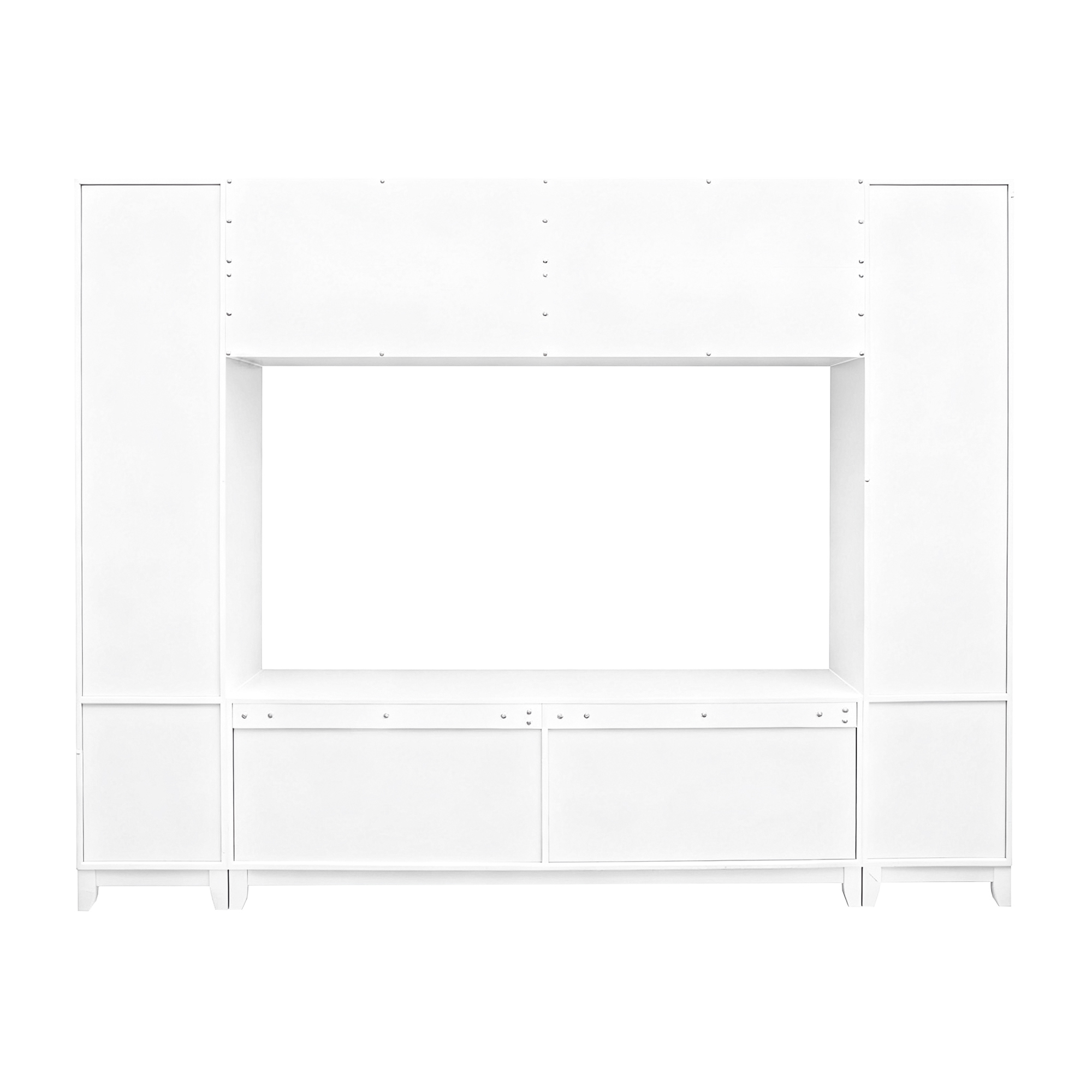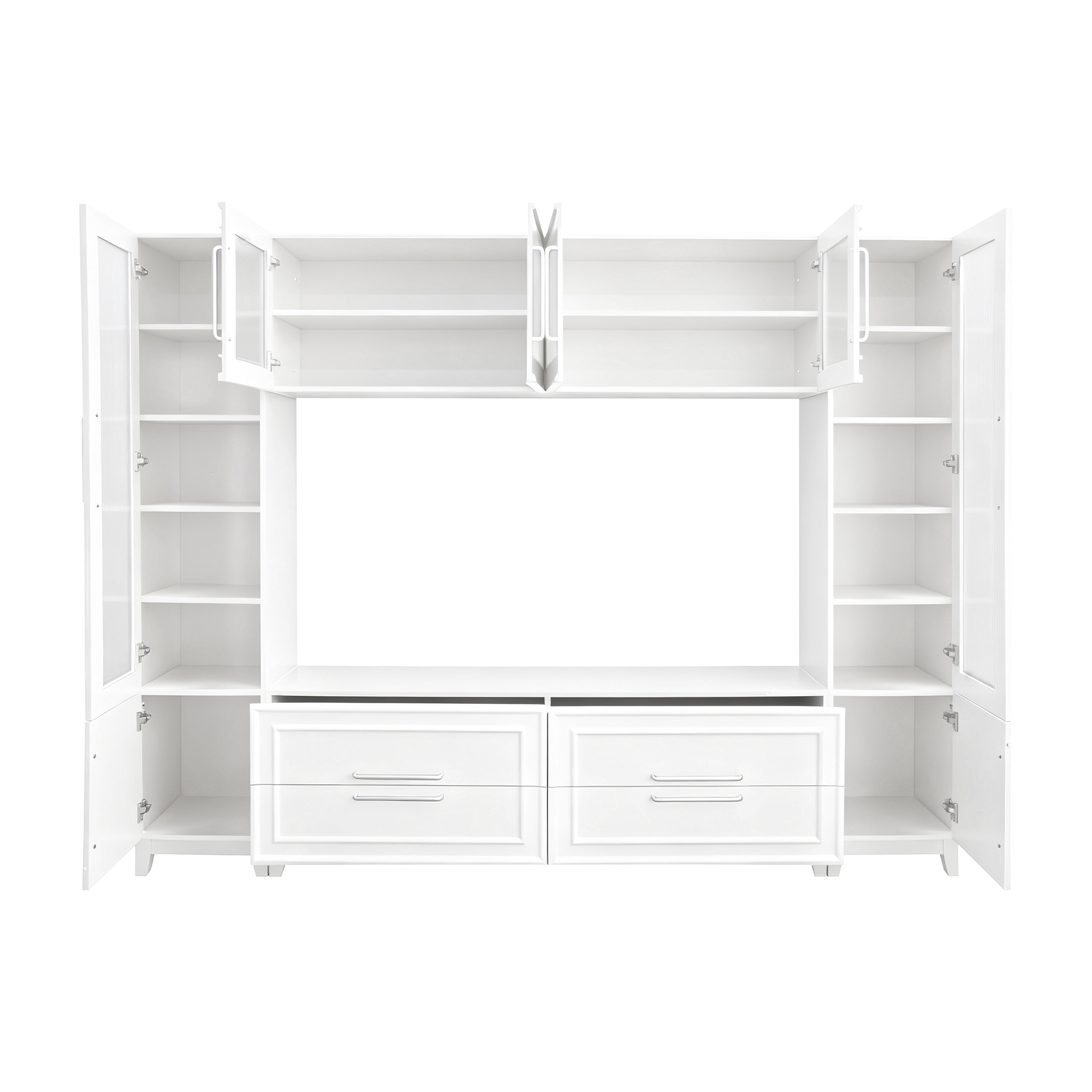 Enjoy a spacious media wall that comfortably supports TVs up to 75 inches. The 80.7-inch overall height and vertically aligned cabinets maximize storage without overwhelming the room. Upper and side cabinets: Perfect for displaying books, art pieces, or memorabilia. Four sealed lower drawers: Ideal for storing remotes, games, DVDs, blankets, or electronics. Open center space: Designed for consoles, speakers, and streaming devices. Every compartment is built to keep your entertainment setup organized, purposeful, and visually clean.