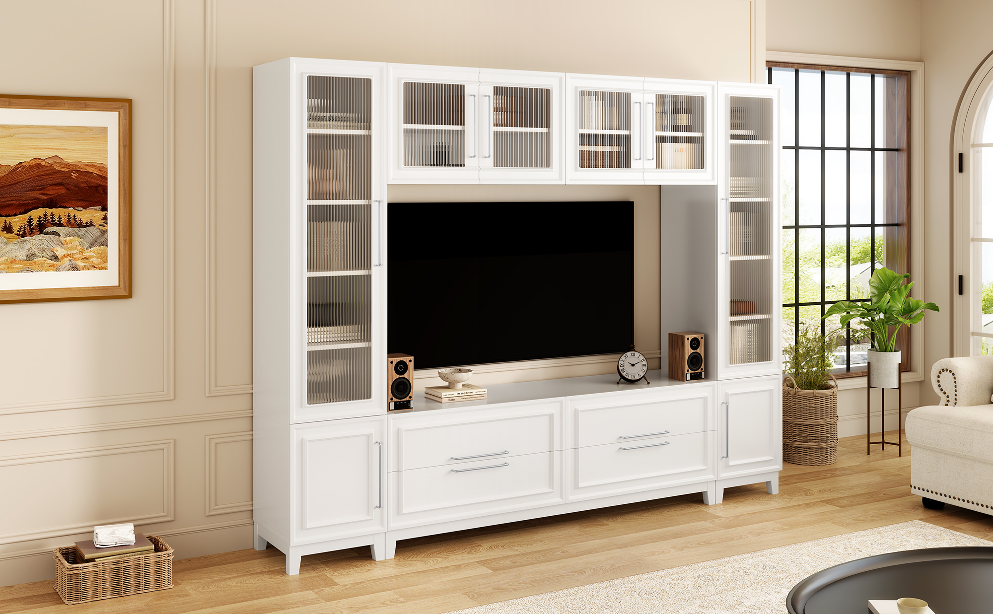 Redefine your living room with this 102-inch modern entertainment center, a perfect blend of style, functionality, and craftsmanship. Designed for TVs up to 75 inches, this full-wall unit brings a sophisticated, contemporary presence to your space while offering exceptional versatility through its modular design.Constructed from premium MDF board, the unit delivers a durable, smooth surface that resists warping and daily wear. The long metal handles add a sleek industrial accent, while striped fluted glass panels on the top and side cabinets lend subtle texture and visual depth. These semi-transparent glass doors balance openness and privacyâideal for displaying decorative objects, books, or collectibles without creating clutter.