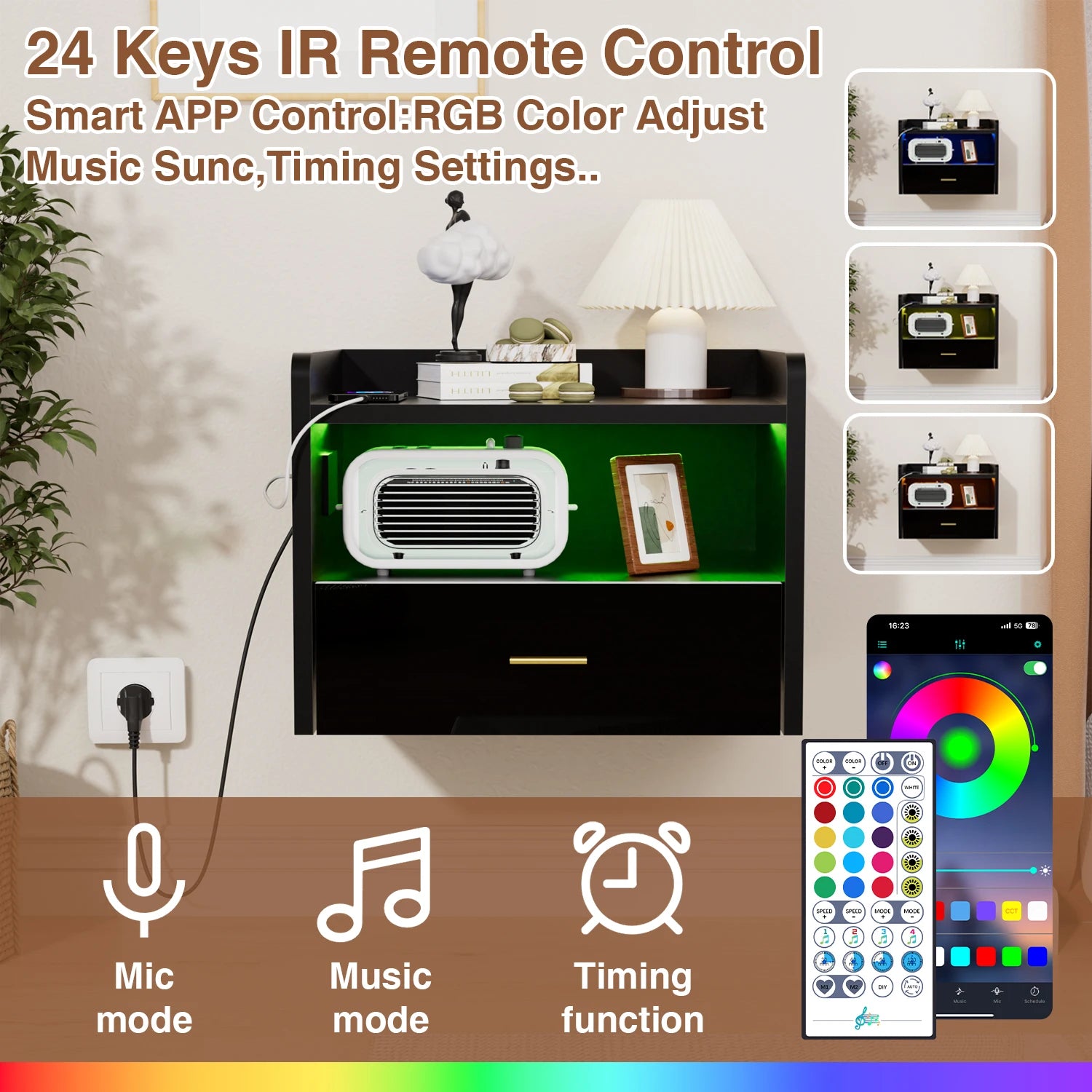 Bedside table with LED light: The LED light has variable RGB colours, so you can choose the light and the mode according to your needs and the scene. It can be controlled manually by pressing the buttons, or with the remote control or mobile app, which is both fun and convenient.adds a warm glow - perfect for nighttime reading or creating a relaxing atmosphere. Energy-efficient and low-heat, the light is discreetly embedded for a seamless look. With 1 AC outlet and 2 USB ports, you can conveniently charge all devices right from your bedside. The cable management keeps wires organized for a clean, modern look.
